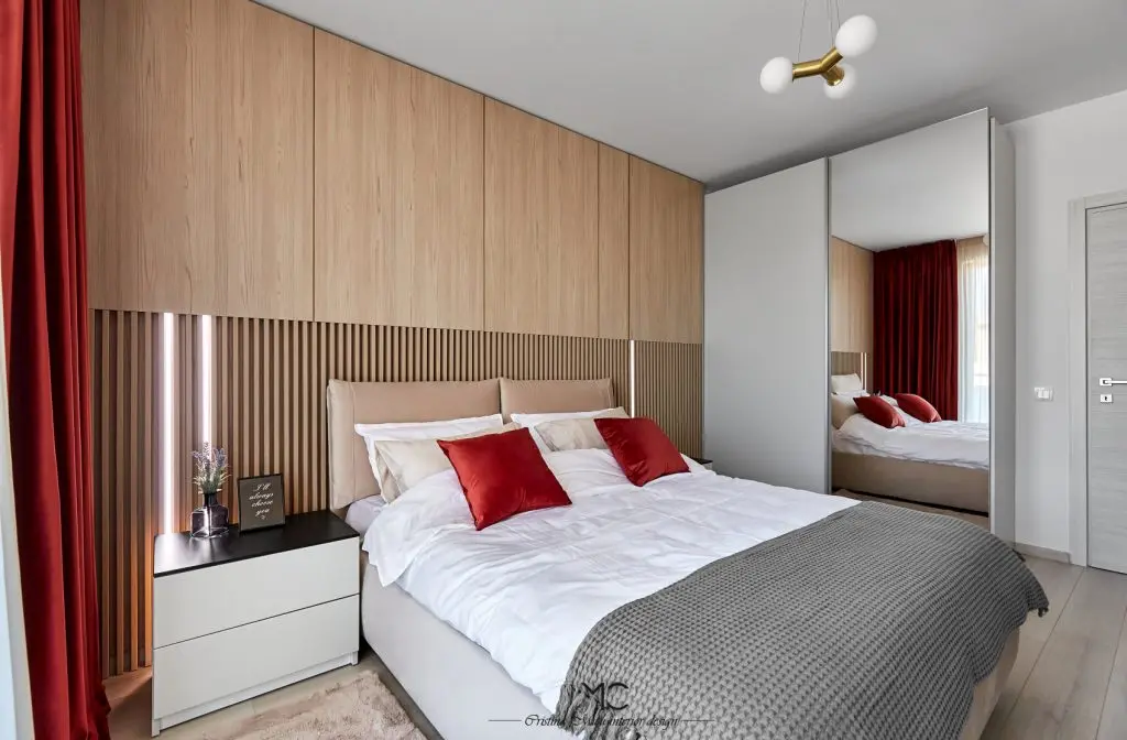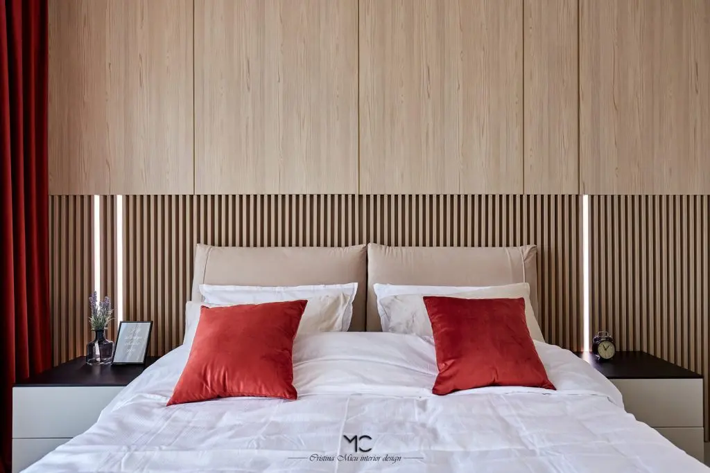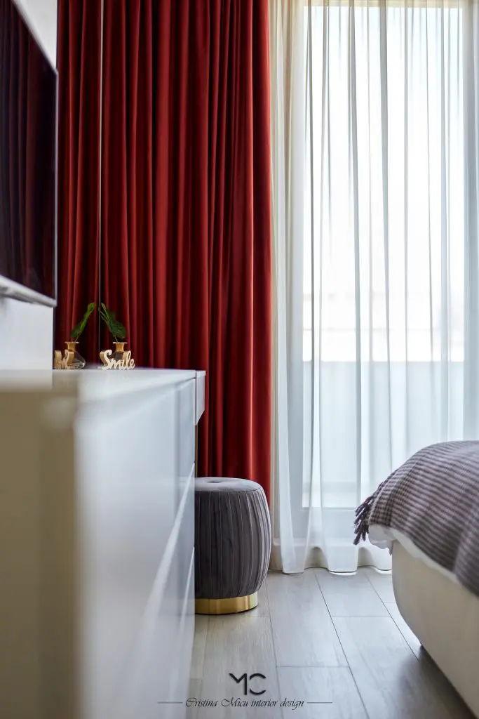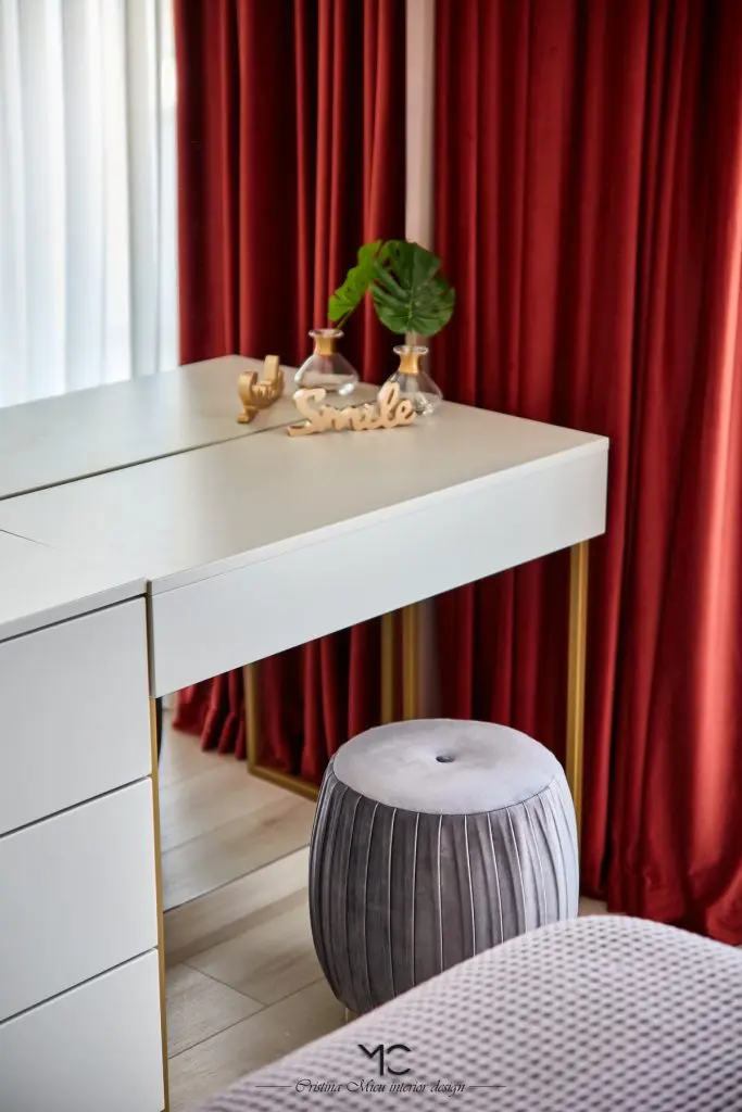 Paleta cromatica pentru care au optat este una luminoasa, in tonuri calde, alb, grej, la care au fost adaugate accente de culori intense (roz pudra, verde in zona de zi, rosu intens in dormitor). Pentru mobilier a fost propus mult alb si nuante de gri deschis, pentru a mari vizual spatiul. Insertiile de piese de lemn au rolul de a incalzi spatiul si a pune in valoare restul elementelor mate, simple, din amenajare.