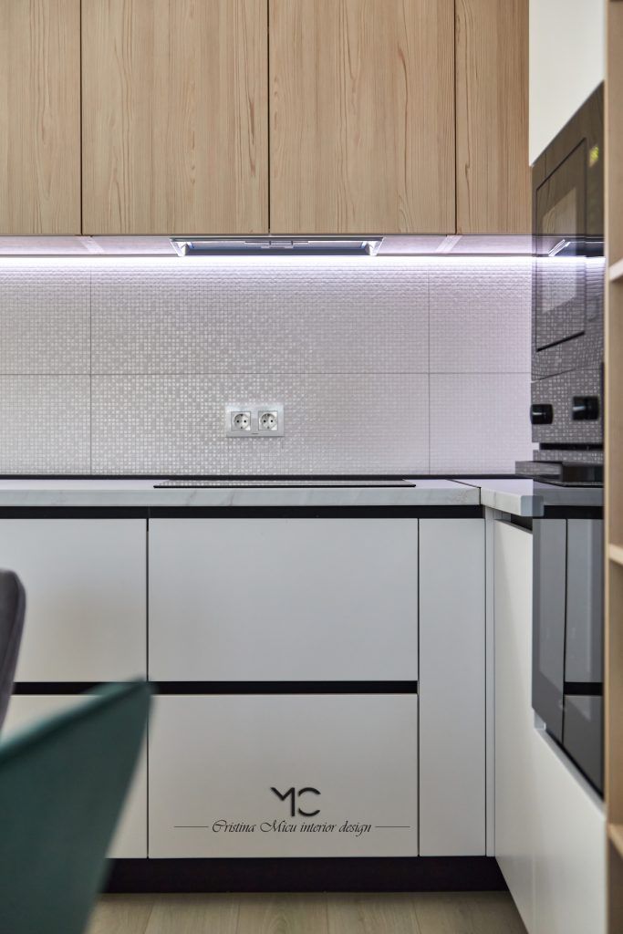 Livingulsi bucataria open space au fost organizate astfel incat sa comunice bine vizual intre ele. Astfel bucataria a fost organizata pe 2 pereti, cu mobilier realizat din mdf vopsit mat alb si pal melaminat Egger cu textura de lemn. Fara manere aplicate, intr-o nota cat mai minimalista.