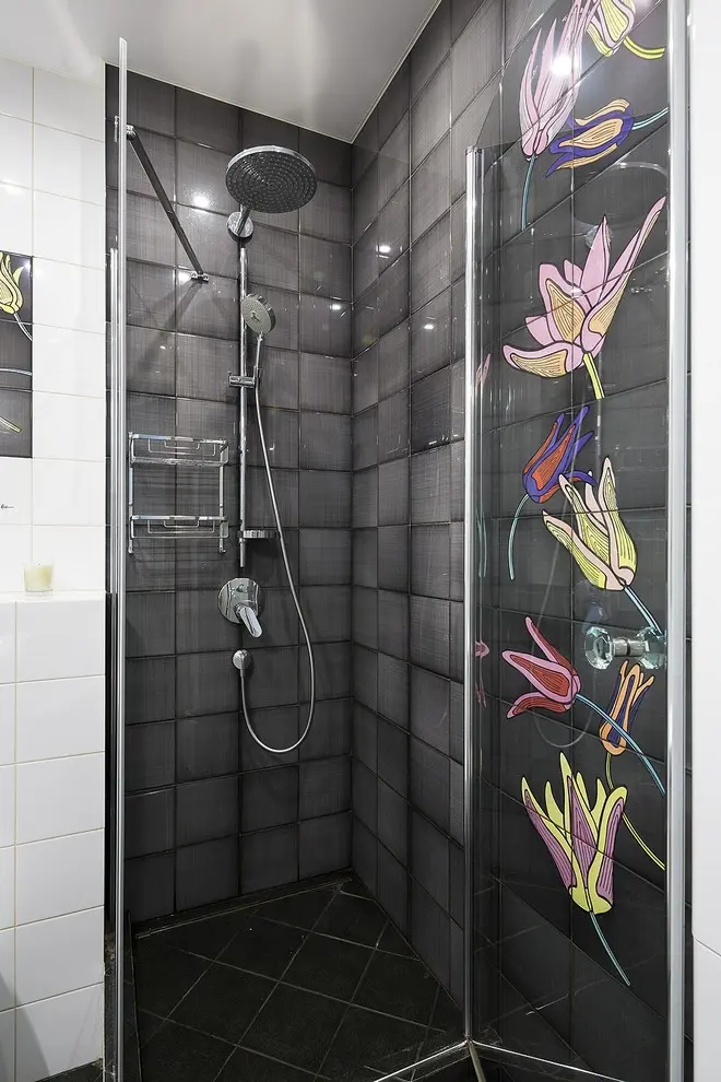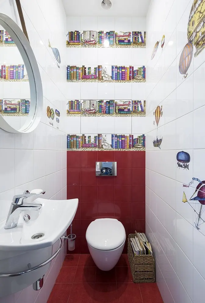 Baia incearca sa iasa cu siguranta din anonimat optandu-se pentru un stil eclectic, o combinatie de stiluri usor neomogena. De o parte a baii gasim culori aprinse si stickere cu design aglomerat, iar de cealalta parte ne linistim vizual si alaturam componente monocromatice.