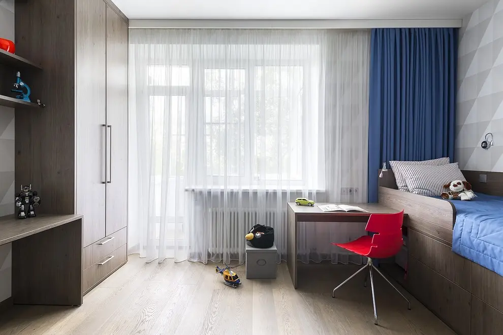 Se alege aceasta varianta deoarece este nevoie in acest caz de mai mult spatiu pentru ca cel mic sa isi poata desfasura activitatile necesare antrenamentului fizic intr-un spatiu special destinat miscarii. O altfel de simetrie se poate observa intre tapetul cu forme geometrice si covorul de mici dimensiuni pozitionat in centrul camerei.