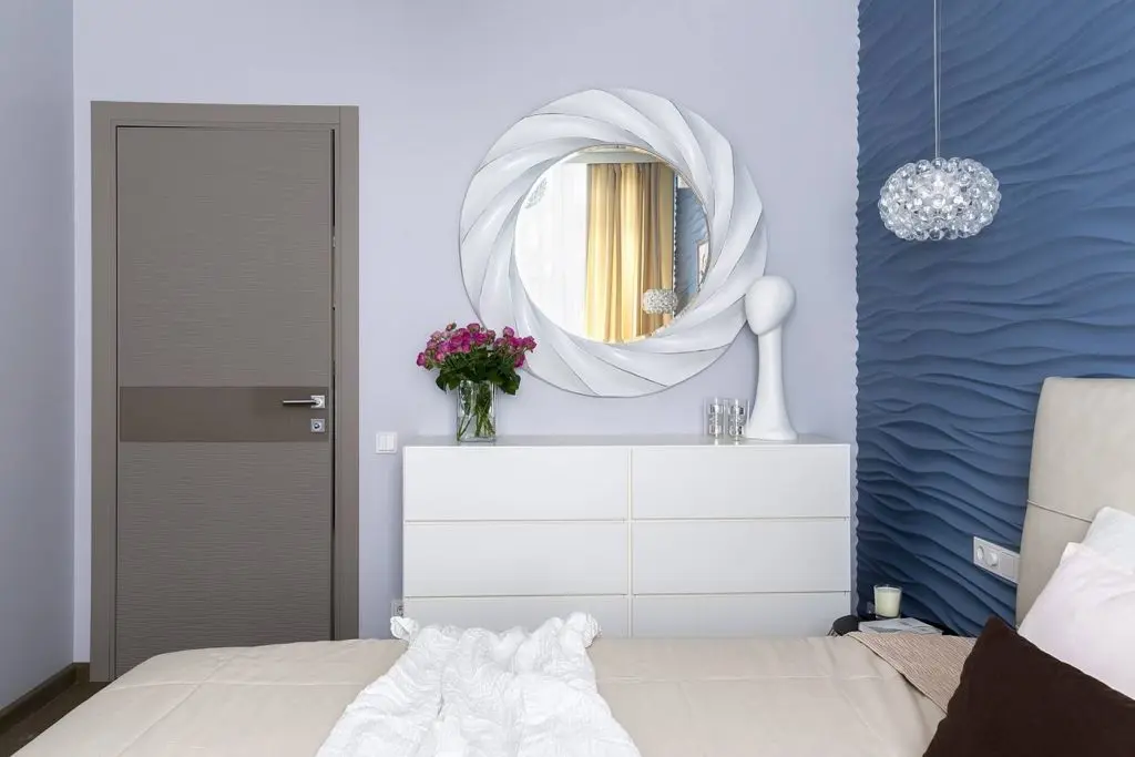 Dormitorul matrimonial inchide atmosfera si pozitioneaza central un pat generos in spatele caruia se face remarcat un tapet tridimensional, de nuanta inchisa, ce hipnotizeaza vizual si aduce incaperii natura in forma ei cea mai adorata: valuri, mare, liniste.Nu avem cum sa nu observam prezenta obiectelor de iluminat moderne dar cu un aer usor vintage ce imita candelabrele din pietre pretioase.