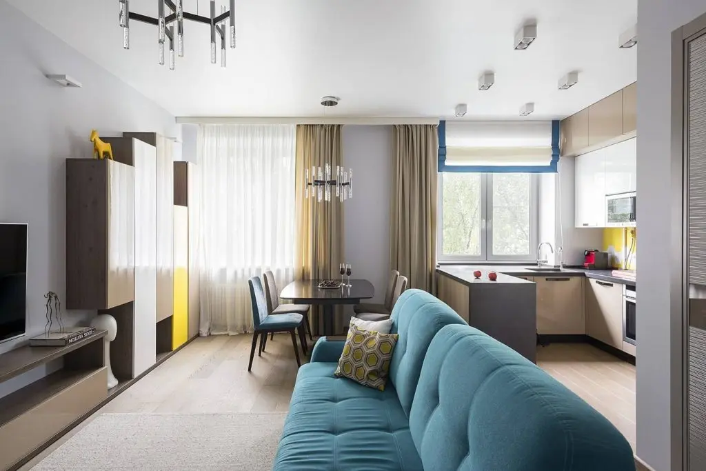 Living-ul si bucataria formeaza un spatiu deschis de dimensiuni impresionante. In stil specific scandinav, accentul cade pe culori, fiind evidentiate nuantele de turcoaz si galben, aflate in perfecta omogenitate cu beige-ul si paletele de gri.