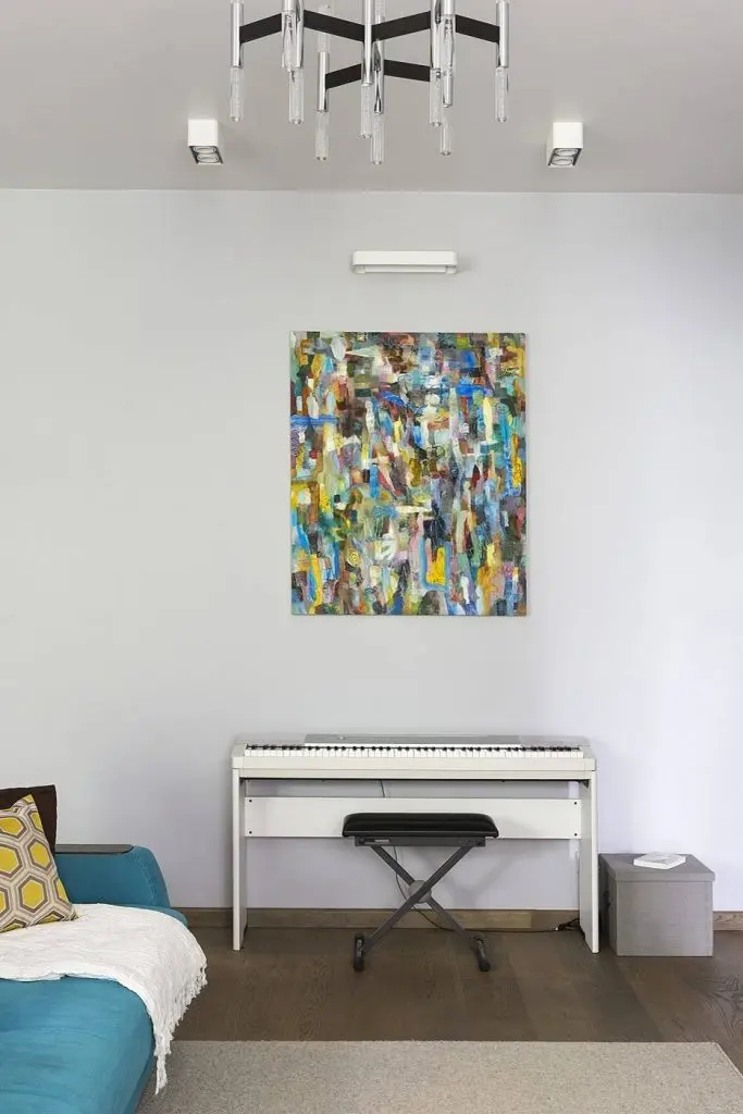 Canapeaua formeaza impreuna cu masa si scaunele o linie imaginara cu rol de delimitare a celor doua zone. Punctul de atractie cel mai important al acestei arii este cu prisosinta pianina electrica de culoare alba desupra careia se pozitioneaza armonios o pictura abstracta in nuante vii.