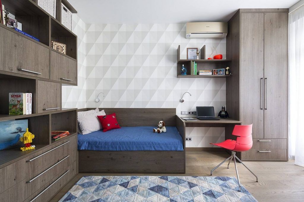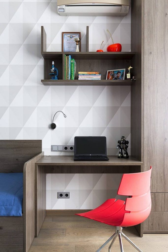 Desi majoritatea consideram ca spatiul de locuit dedicat celor mici trebuie sa iasa in evidenta prin culori accentuate, iata ca in aceasta situatie functionalitatea este cea careia i se acorda cea mai mare importanta: o mobila inchisa la culoare si compacta ce uneste biblioteca, patul, biroul si dulapiorul de haine.