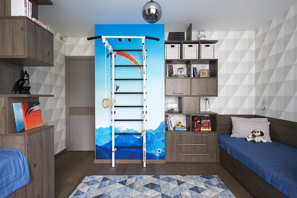 Se alege aceasta varianta deoarece este nevoie in acest caz de mai mult spatiu pentru ca cel mic sa isi poata desfasura activitatile necesare antrenamentului fizic intr-un spatiu special destinat miscarii. O altfel de simetrie se poate observa intre tapetul cu forme geometrice si covorul de mici dimensiuni pozitionat in centrul camerei.