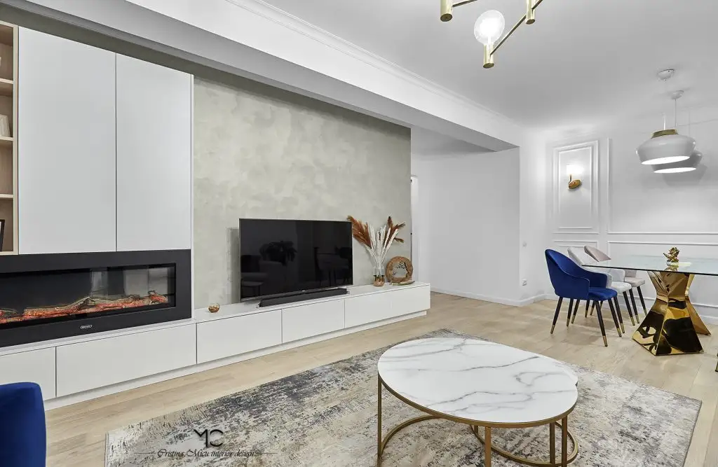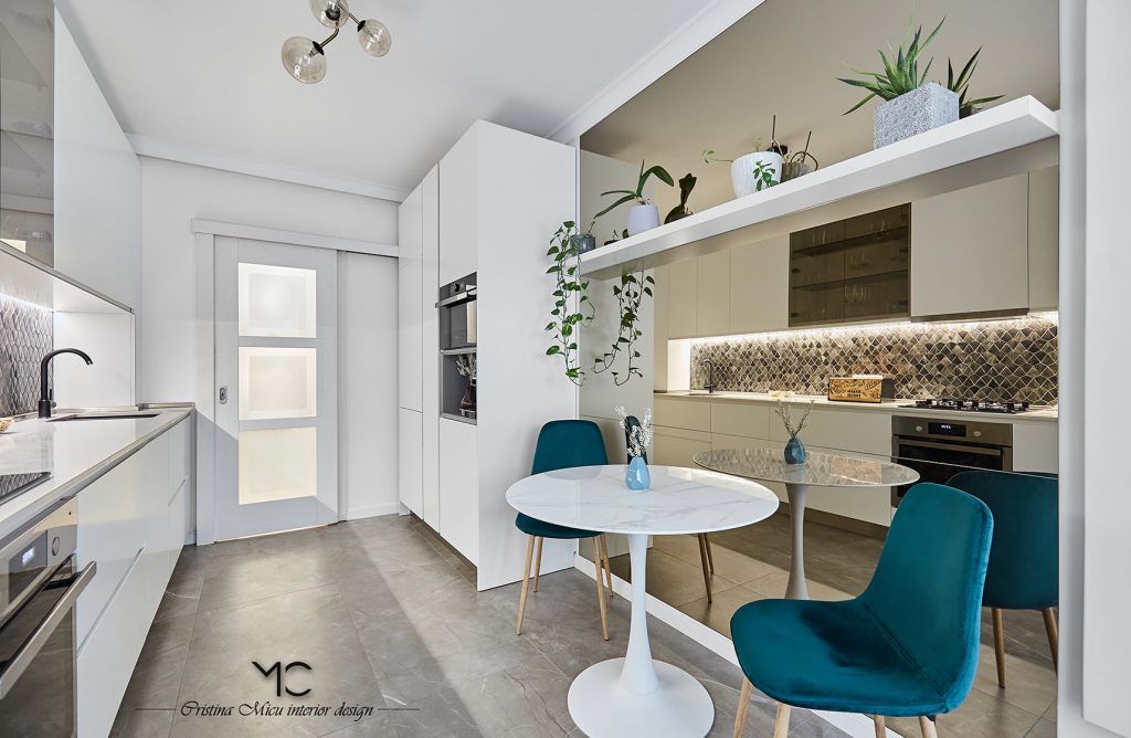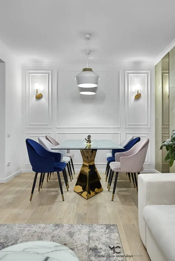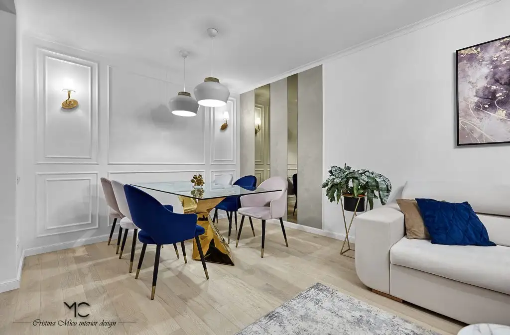 In conturarea unei atmosfere glam, cu accente clasice, a contribuit si folosirea unor vopsele decorative cu texturi catifelate, in zona de living, dining si hol. Regasim si ancadramente si cornise realizate din profile duropolimer folosite la delimitarea unor zone ale peretilor si marcarea conturului plafonului.