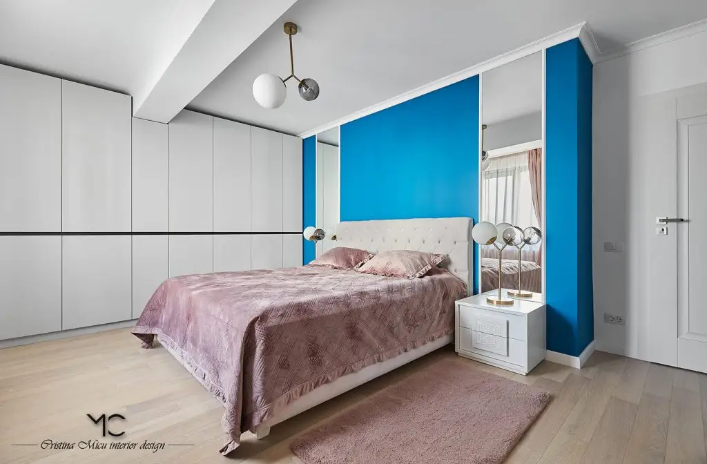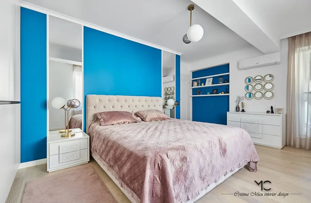 Oglinzile folosite in amenajare maresc vizual spatiul si ajuta la ghidarea luminii, in timp ce puncteaza zone cheie ale locuintei. Au fost propuse in toata zona de zi dar si in dormitor, pe peretele cu tablia patului.