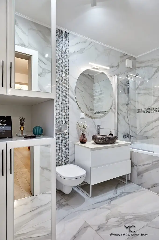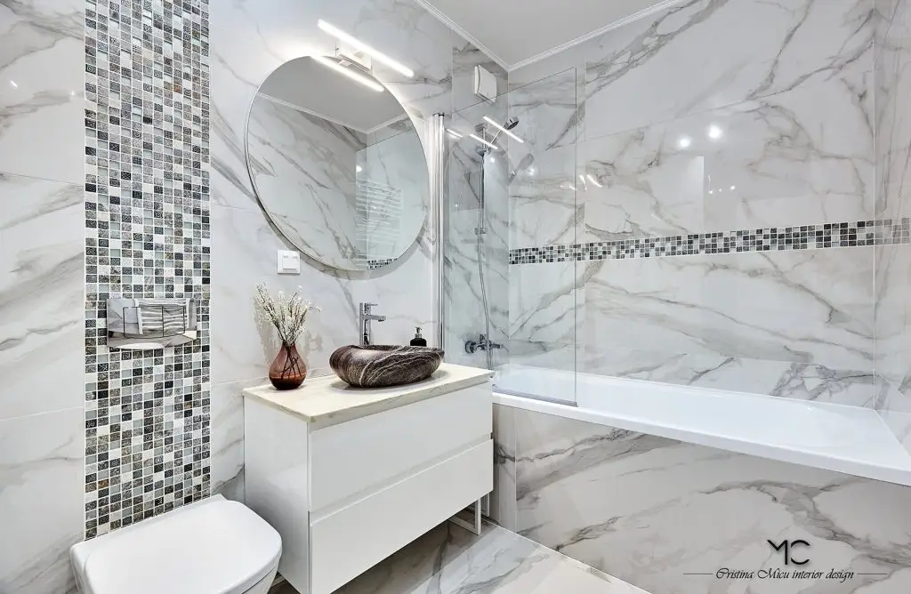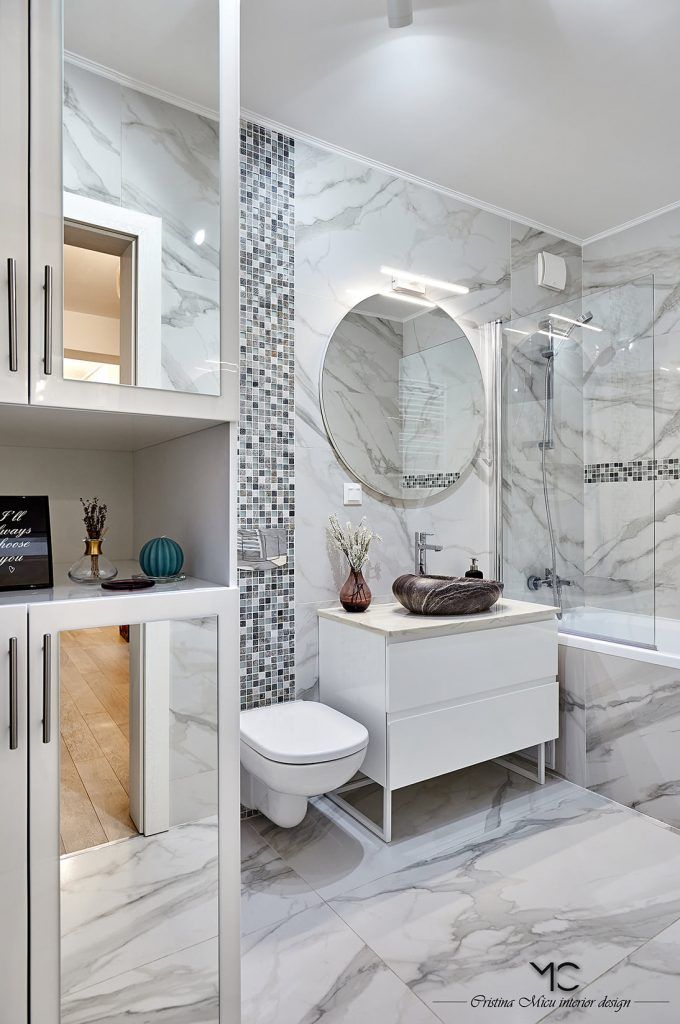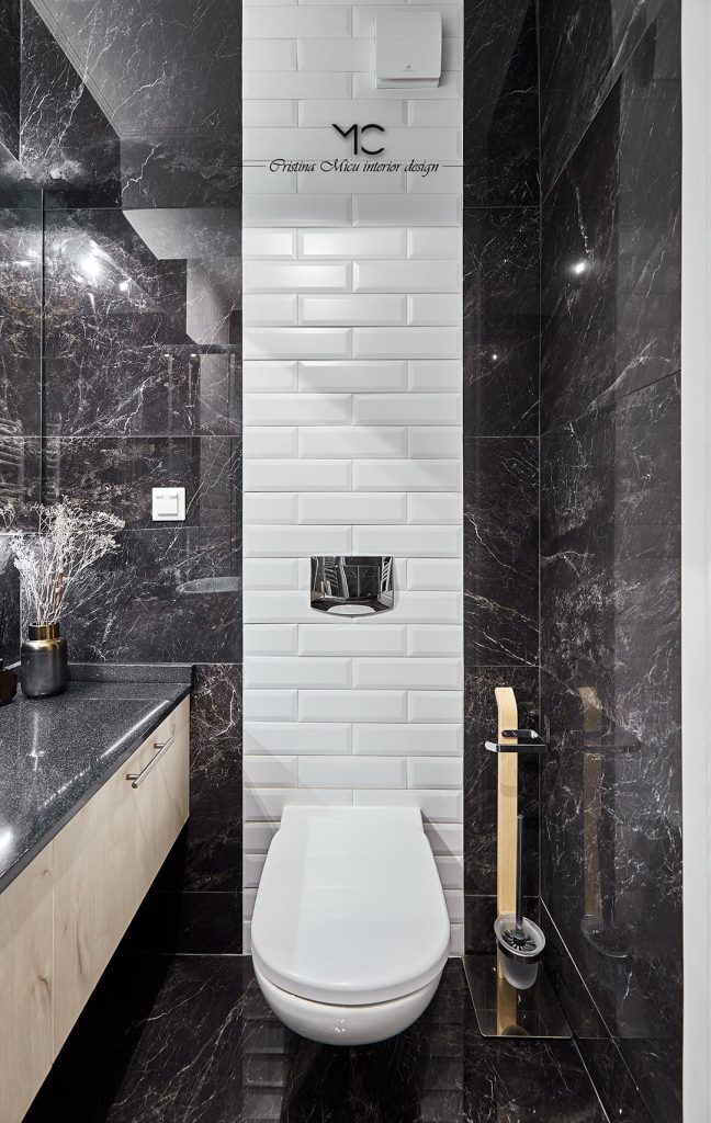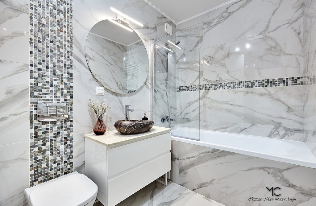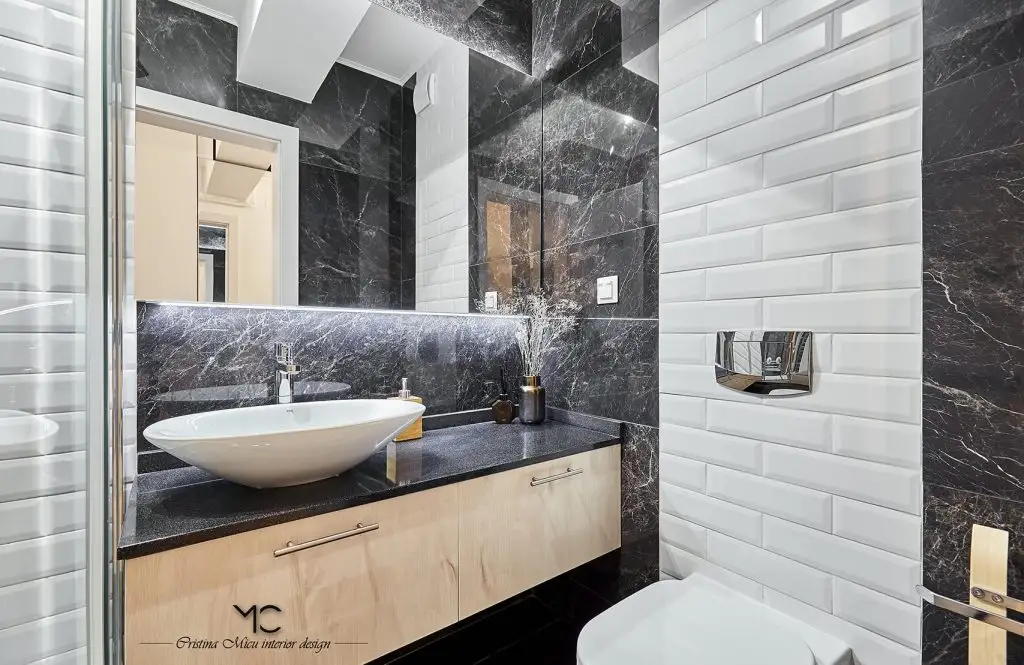 Pentru finisajele bailor au fost alese placari cu faianta cu aspect de marmura, marmura alba pentru baia ei si marmura neagra pentru baia lui, mozaic L’Antic Colonial pentru zona accent din baia mare. Lavoarul din piatra naturala vine armonios in completarea atmosferei generale.