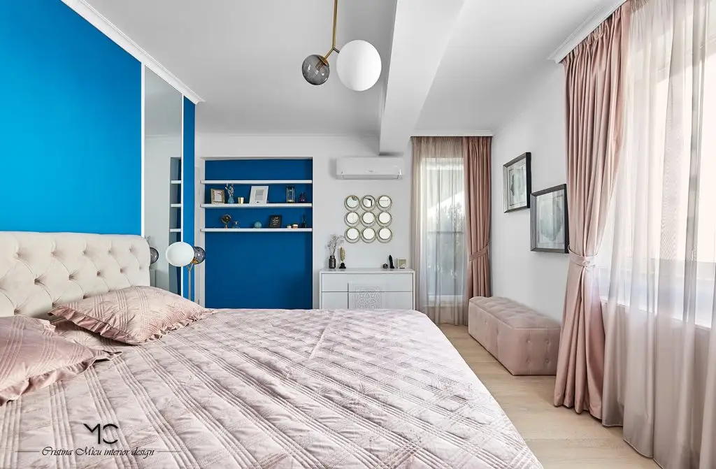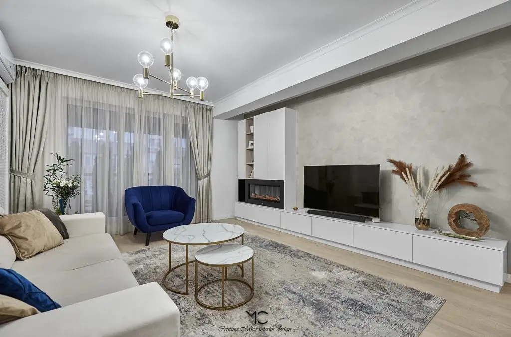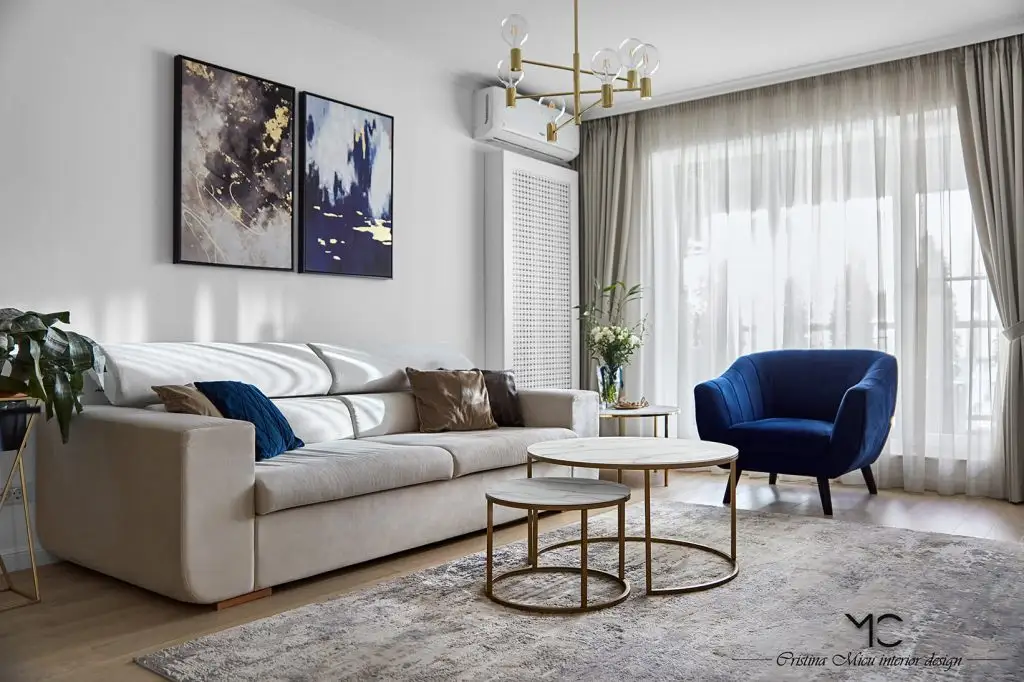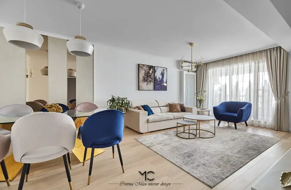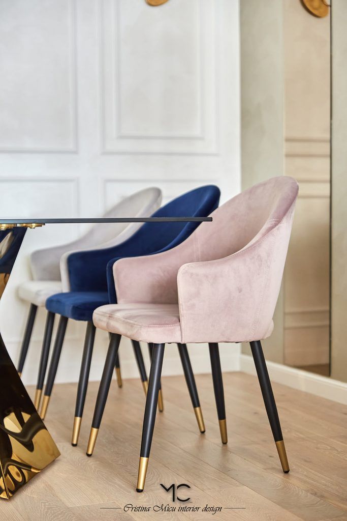 Materialele catifelate folosite la draperii si mobilierul tapitat contureaza o atmosfera boema, in timp ce aduc un plus de confort spatiului. Fotoliul din living, tapitat cu catifea intr-o nuanta de albastru electric este accentul curajos, elementul -vedeta al zonei de zi.