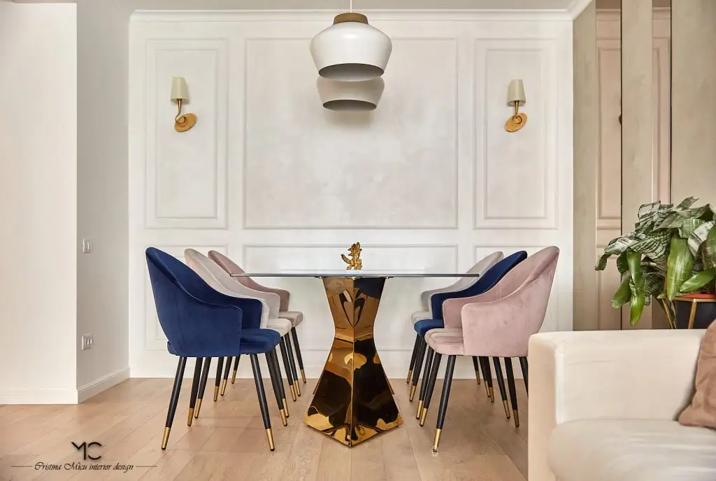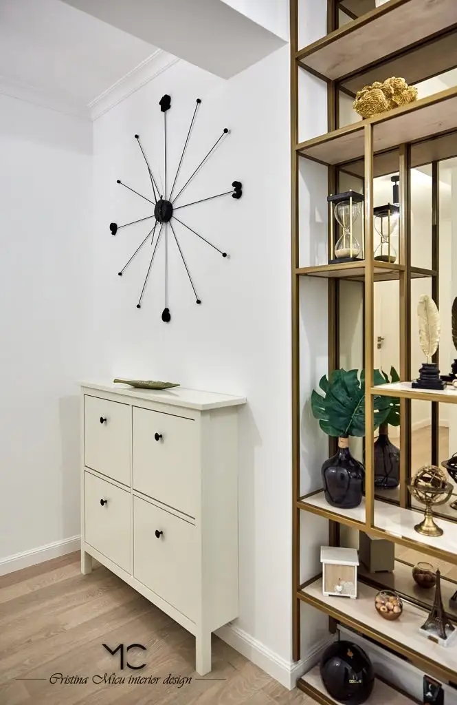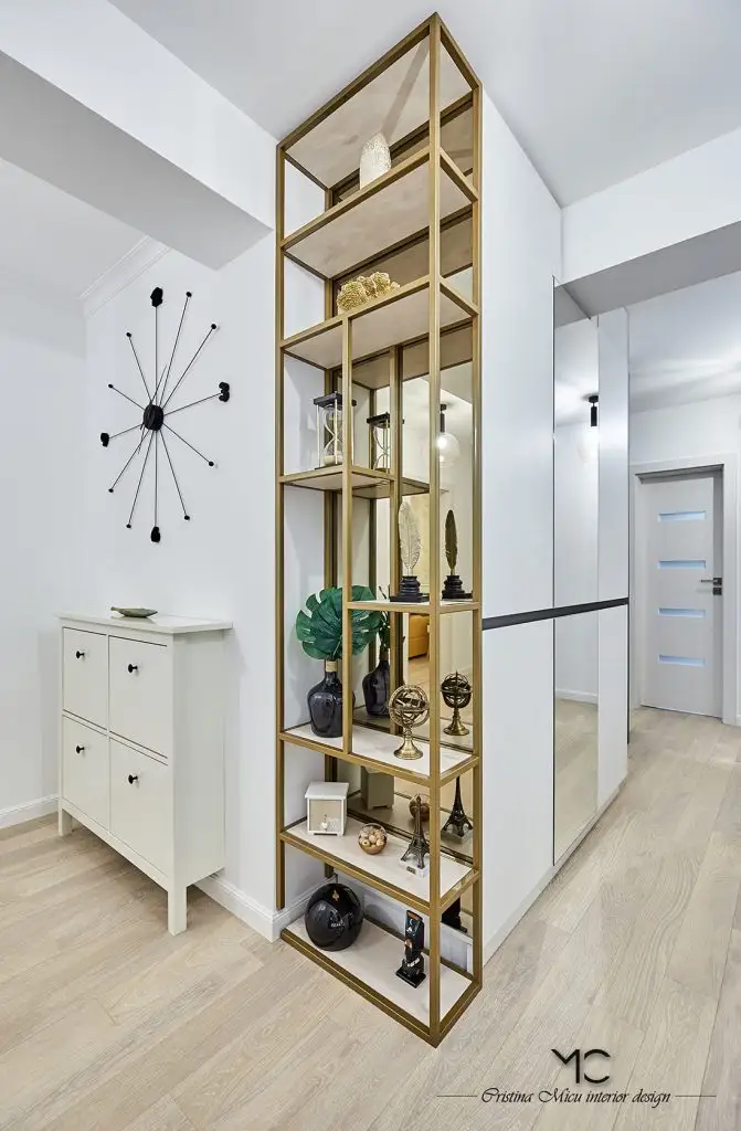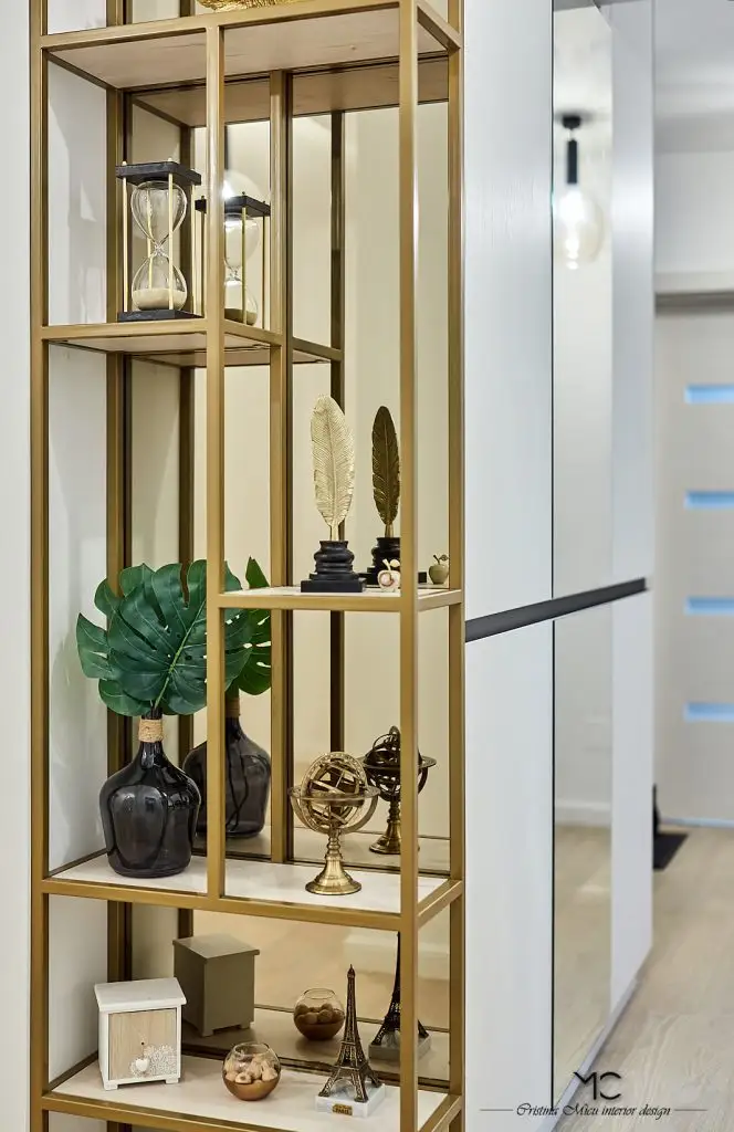 Impreuna cu oglinzile, accentele aurii (folosite la piesele de mobilier si corpurile de iluminat) confera eleganta amenajarii si marcheaza reusit anumite zone de interes.