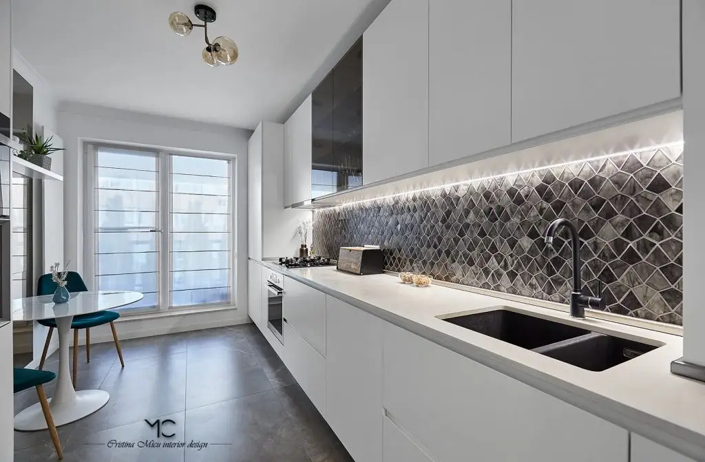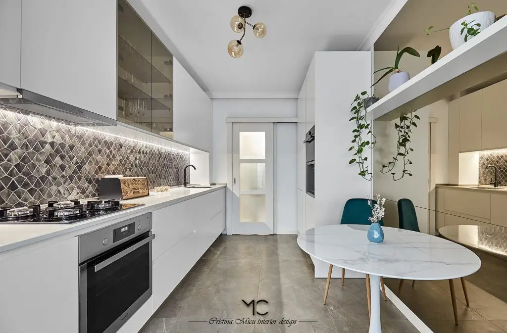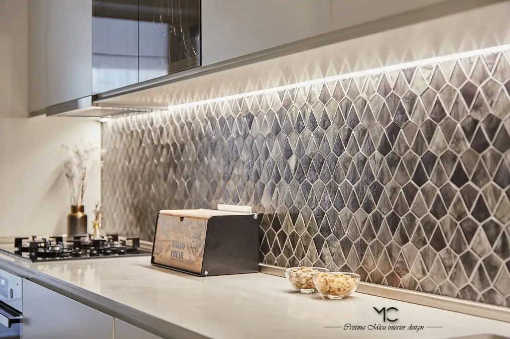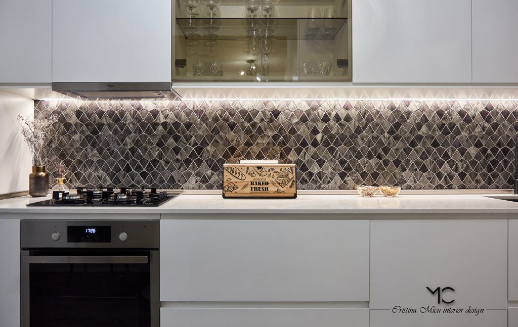 Gresia finisaj marmura a fost folosita in bucatarie; completata de mozaicul deosebit utilizat pentru placarea zonei de deasupra blatului de lucru.