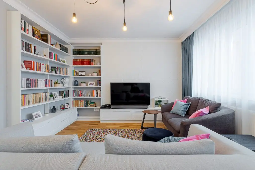 Biblioteca generoasa in forma de “L” ,realizata la comanda, se continua armonios cu o comoda pe care este amplasat televizorul. In holul de intrare au optat pentru dulapuri incastrate pe toata inaltimea peretelui asigurand astfel suficiente spatii de depozitare. Incorporate in mobilierul alb cu frezari clasice regasim bancheta si spatarul ca un accent puternic din material textil rosu.