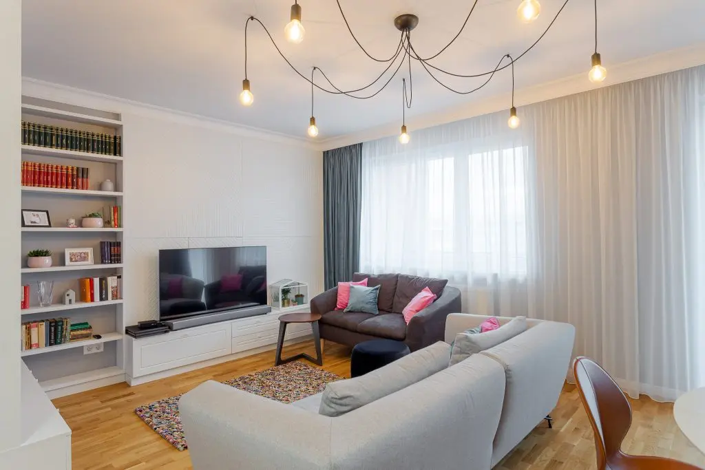 Livingul si zona de dining formeaza un spatiu aerisit, modern si plin de viata. Corpul de iluminat cu multe brate care ocupa o suprafata mare din plafon unifica armonios zonele functionale ale incaperii. Fundalul neutru este contrastat de accentele de culoare ale decoratiunilor.