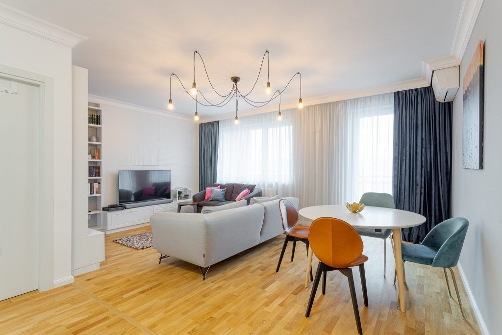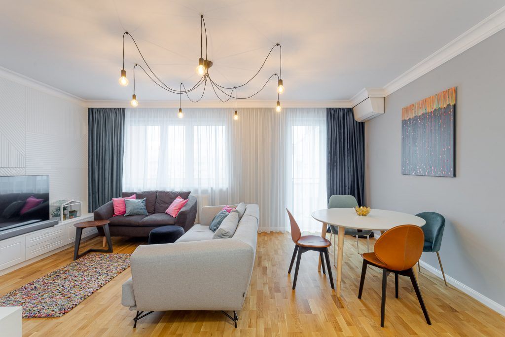 Livingul si zona de dining formeaza un spatiu aerisit, modern si plin de viata. Corpul de iluminat cu multe brate care ocupa o suprafata mare din plafon unifica armonios zonele functionale ale incaperii. Fundalul neutru este contrastat de accentele de culoare ale decoratiunilor.