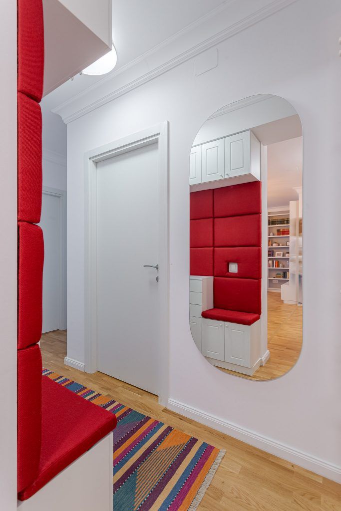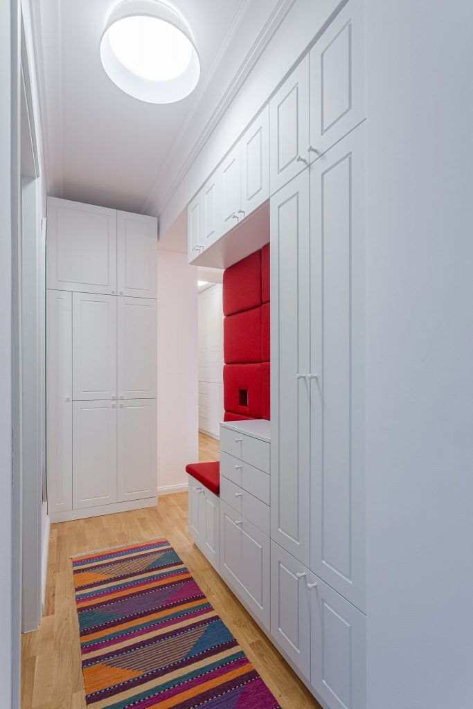 Biblioteca generoasa in forma de “L” ,realizata la comanda, se continua armonios cu o comoda pe care este amplasat televizorul. In holul de intrare au optat pentru dulapuri incastrate pe toata inaltimea peretelui asigurand astfel suficiente spatii de depozitare. Incorporate in mobilierul alb cu frezari clasice regasim bancheta si spatarul ca un accent puternic din material textil rosu.