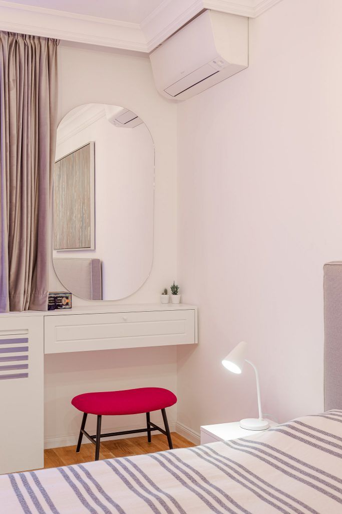 Apartamentul face parte dintr-un complex rezidential si a fost predat la cheie. Transformarile ulterioare au fost subtile, dar de efect; s-a mizat mult pe zonificari din mobilier si exploatarea maxima a spatiilor de depozitare. Un detaliu extrem de functional si atragator este bancheta continua de sub geamul din camera copilului, care in dormitorul matrimonial se transforma intr-o masca de calorifer.
