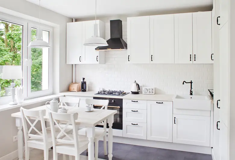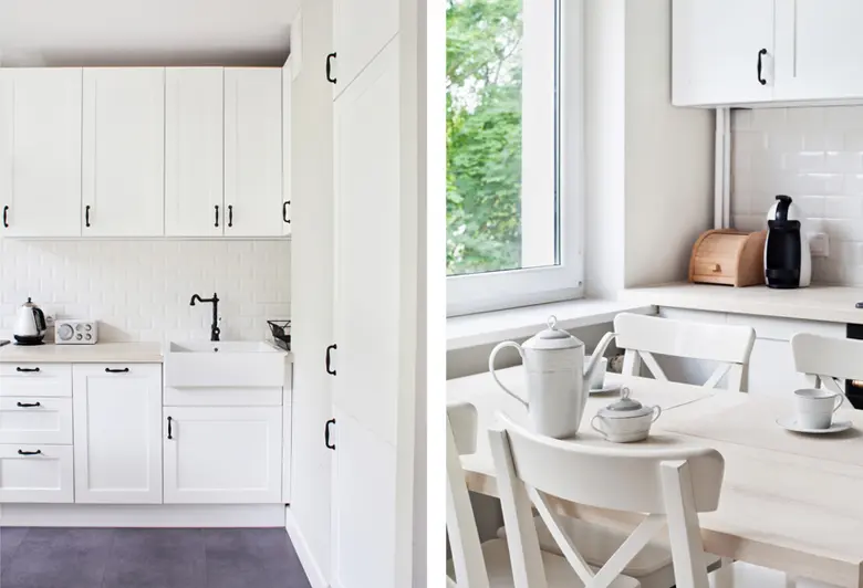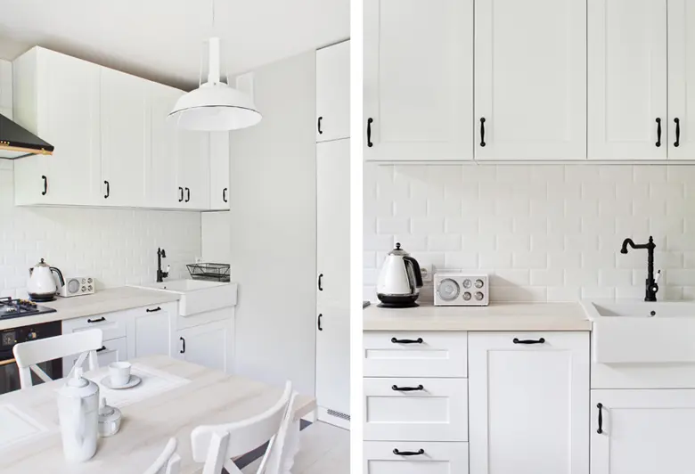 Bucataria este una din camerele care ne-a atras atentia intr-un mod placut. Cu un mobilier alb, realizat impecabil la comanda, acest spatiu atrage prin prisma luminozitatii pe care o emana. Accentele de negruredate prin manerele, bateria neagra si cateva electrocasnice negre reusesc sa transforme amenajarea. Placile ceramice tip Metro, tot albe, confera un plus de stralucire camerei. Locul de luat masa alaturi de corpurile de iluminat respecta paleta cromatica a bucatarie per ansamblu; pozitionarea la fereastra este un mare atu pentru toti cei ai casei sau chiar a musafirilor.