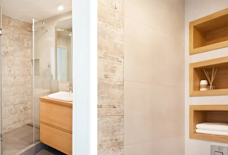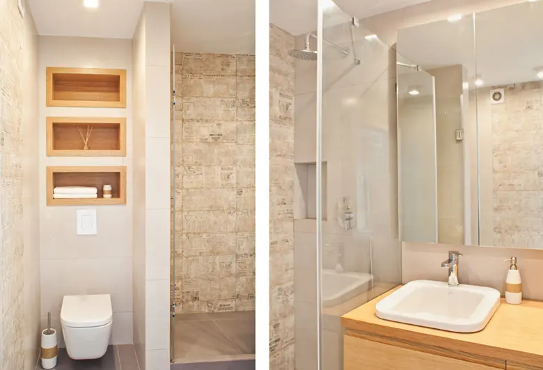 In ceea ce priveste baia, spatiile de depozitare incastrate in nise, precum si dulapul de sub lavoar reusesc sa incalzeasca decorul prin esenta de lemn natur folosita. Ideea unei zone dus cu scurgere in pardoseala, dar separata de vasul de toaleta, este excelenta; desi mica, baia este impartita in zone bine delimitate.