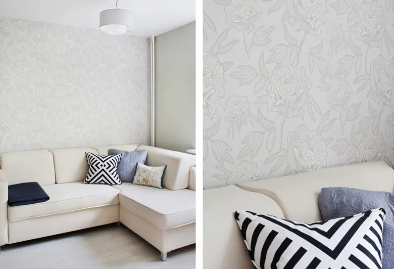 Pentru zona de zi, culorile neutre, mai exact un crem foarte deschis, amplifica spatiul si luminozitatea incaperii. Tapetul, cu un motiv floral discret pune in valoare amenajarea prin senzatiile tactile pe care ni le induce. Pernele decorative sunt singurele tuse de culoare.