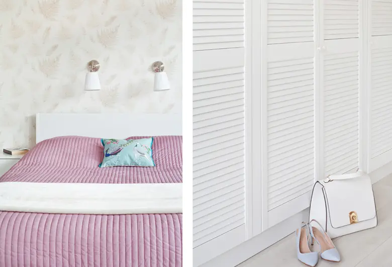 Acelasi lucru il putem spune si despre dormitor. Aici singurele accente de culoare il reprezinta cuvertura patului. Ne plac dulapurile inalte si usile in special. Si aici tapetul folosit pentru a contura zona patului vine cu un imprimeu discret ce ne aminteste de spiritul provensal interpretat intr-o varianta moderna.