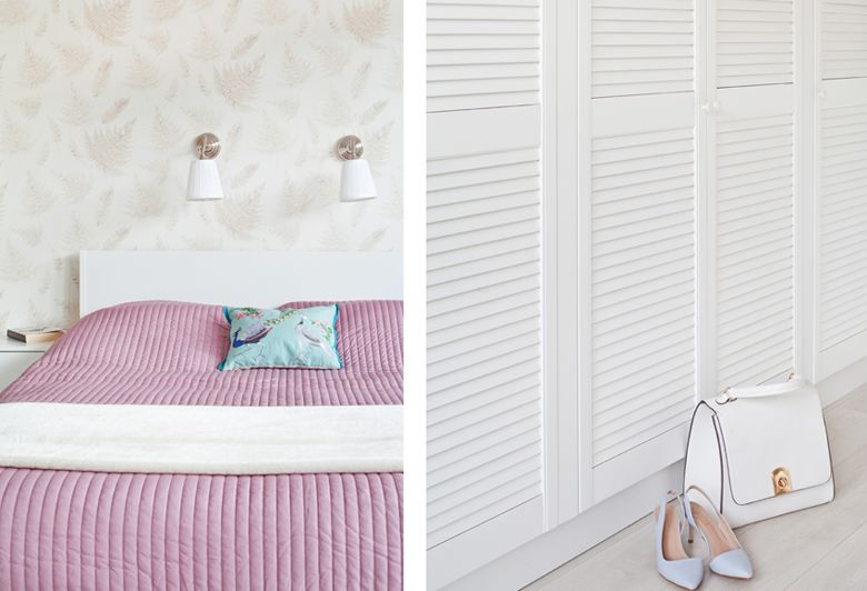 Acelasi lucru il putem spune si despre dormitor. Aici singurele accente de culoare il reprezinta cuvertura patului. Ne plac dulapurile inalte si usile in special. Si aici tapetul folosit pentru a contura zona patului vine cu un imprimeu discret ce ne aminteste de spiritul provensal interpretat intr-o varianta moderna.