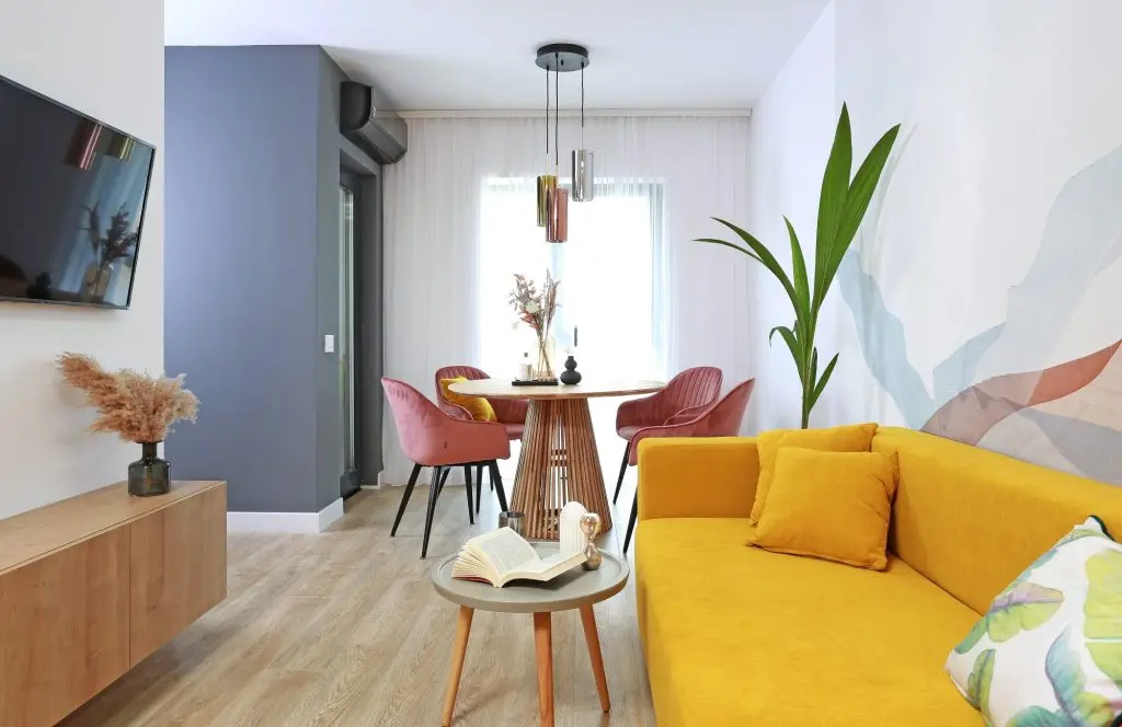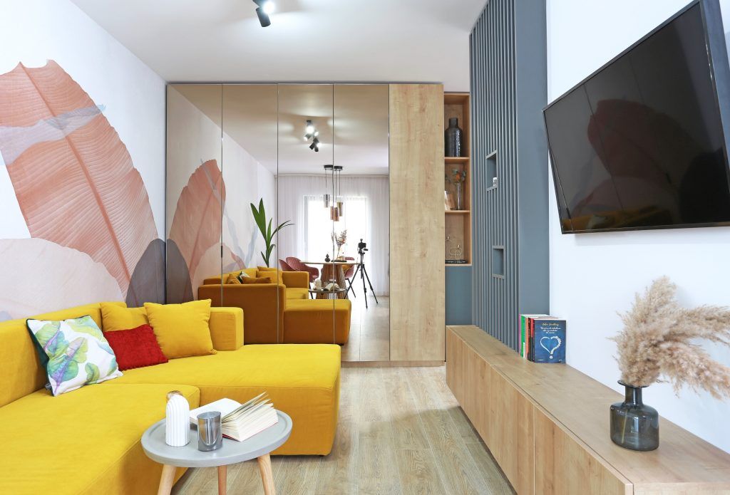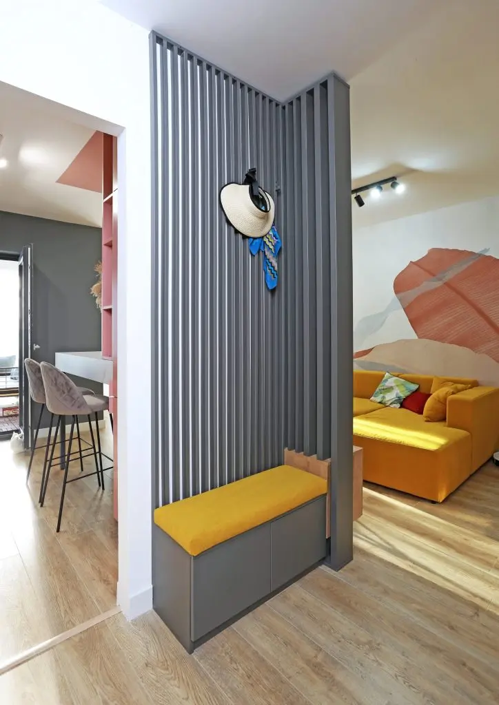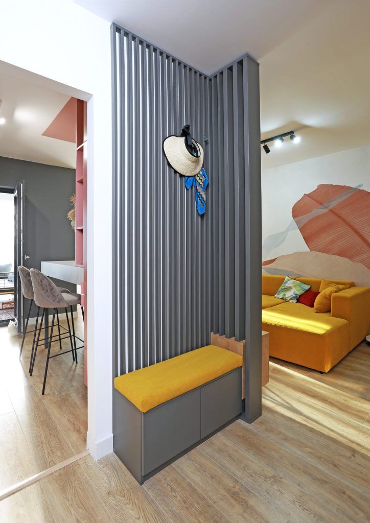 Apartamentul cu doua camere din complexul rezidential Parcului 20, aflat in vecinatatea parcului Herestrau din Bucuresti, se remarca printr-o paleta cromatica indrazneata, cu accente puternice de culoare (galben mustar, roz pudra, tente de aurii).
