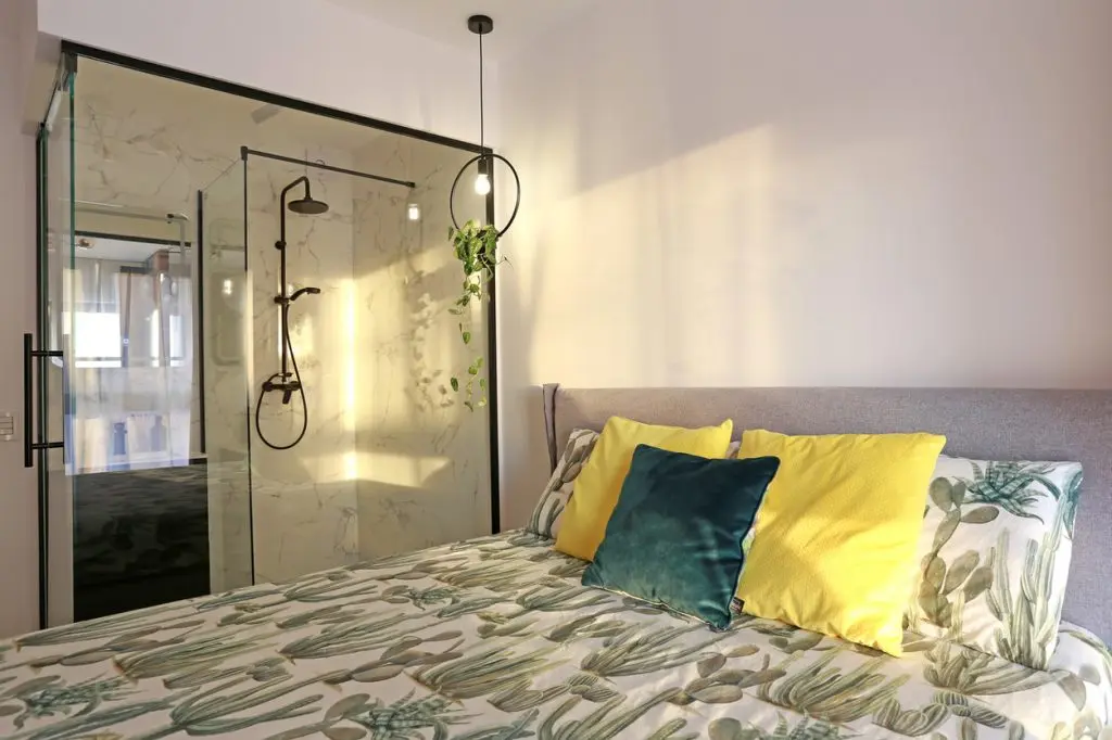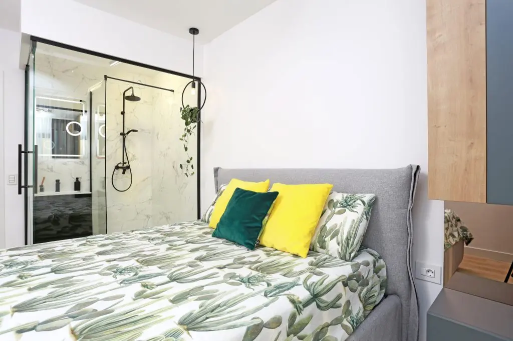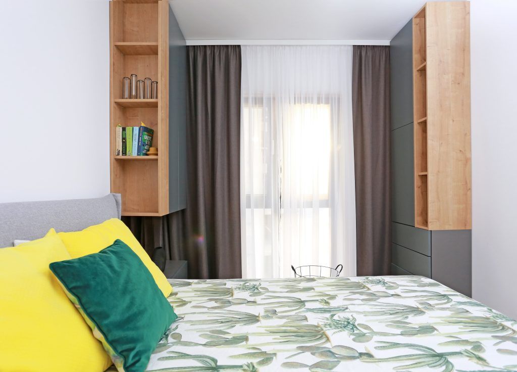 Dormitorul este destul de aerisit; avand o suprafata relativ mica, designerii au optat pentru mutarea dressingului principal pe unul din peretii livingului, cu usile placate cu sticla bronze pentru a mari vizual spatiul si a capta mai multa lumina naturala.