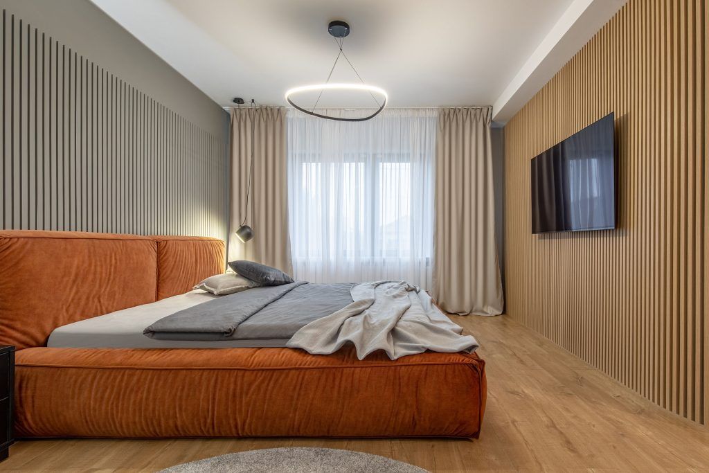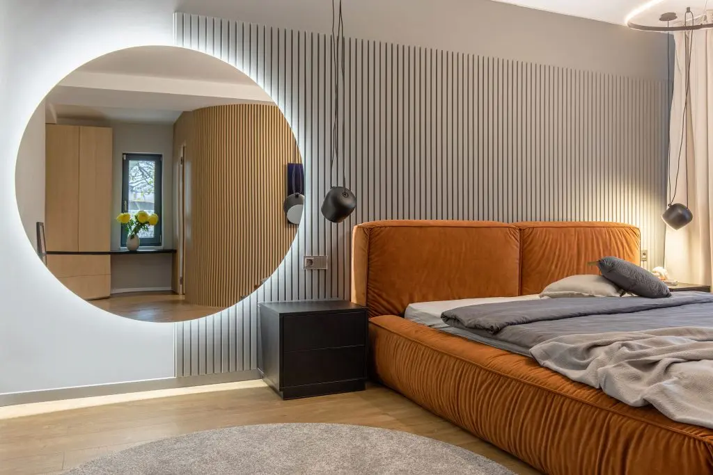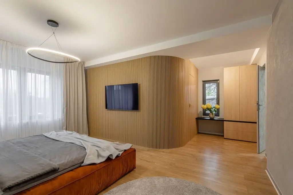 Riflajul din lemn natur, curbat pentru a masca un colt exterior nedorit, contribuie la atmosfera calda a dormitorului.
