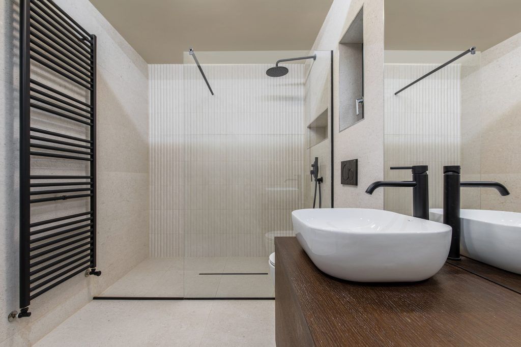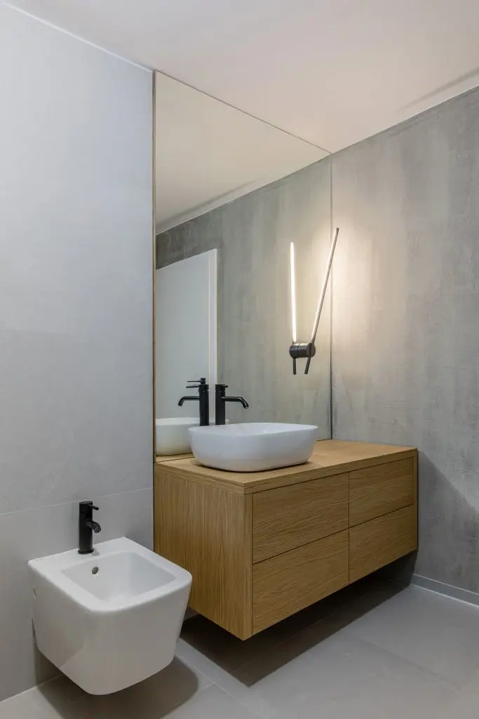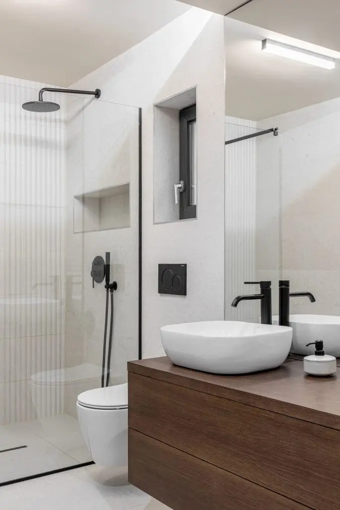 “Pentru bai am ales tonuri neutre si deschise, cu mici variantii discrete ale texturilor, in contrast cu acestea am inserat accente de negru mat aferente bateriilor si accesoriilor sanitare.”