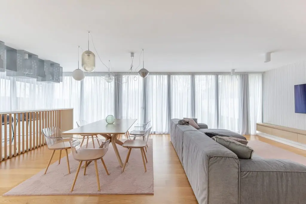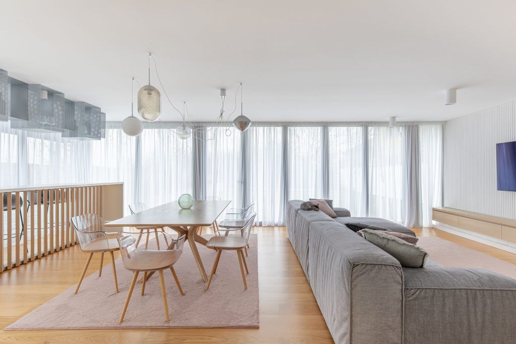 Lemnul masiv in tonuri deschise de stejar si fag, nuante de gri deschis folosite pentru materialul textil al canapelei si pentru draperii, efectul de beton aparent pe care il regasim la bucatarie si pe peretele cu usile glisante din sticla; toate acestea sunt puse cu grija intr-un echilibru cald-rece, moale-dur, reusind sa contureze o atmosfera relaxanta.