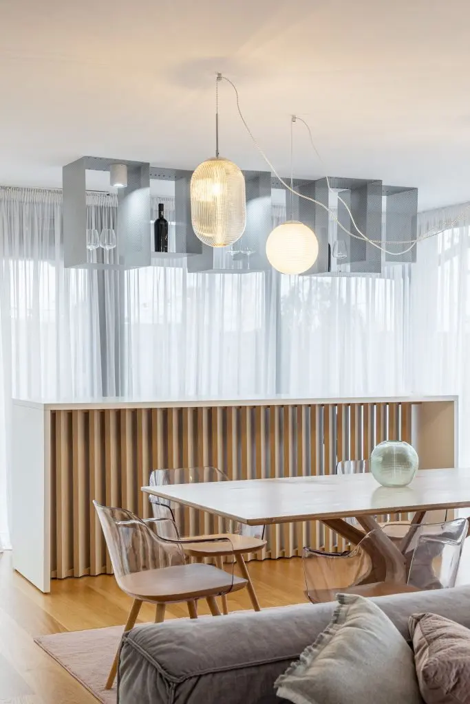 Deschide GaleriaDupa recompartimentare, partea din mijloc a casei a devenit spatiul intermediar si inima locuintei in acelasi timp. Livingul este format din trei zone care comunica vizual una cu cealalta si ofera o experienta variata de relaxare si petrecere a timpului liber: zona de bar, diningul si zona de lounge.