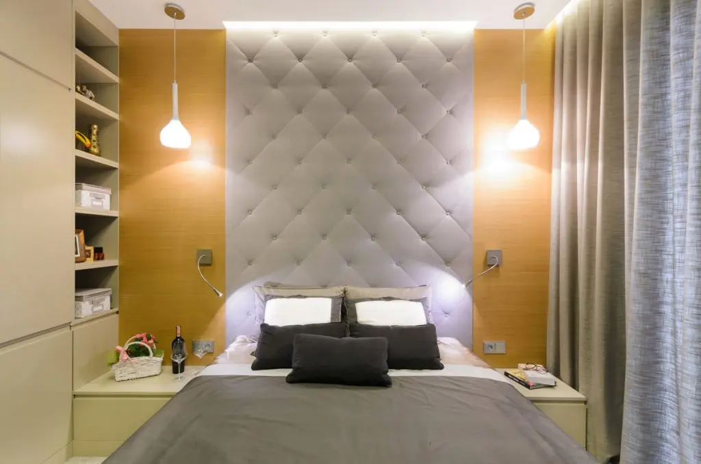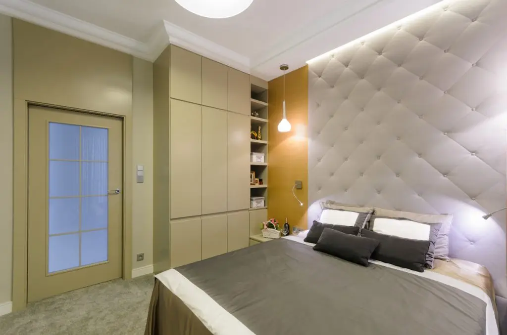 Zona de noapte inglobeaza un dormitor matrimonial, un birou si o baie. Designul dormitorului matimonial preia cromatica abordata in restul amenajarii. Capitonarea peretelui din spatele patului si folosirea unei mochete albe dintr-un material moale sporeste ideea de confort.