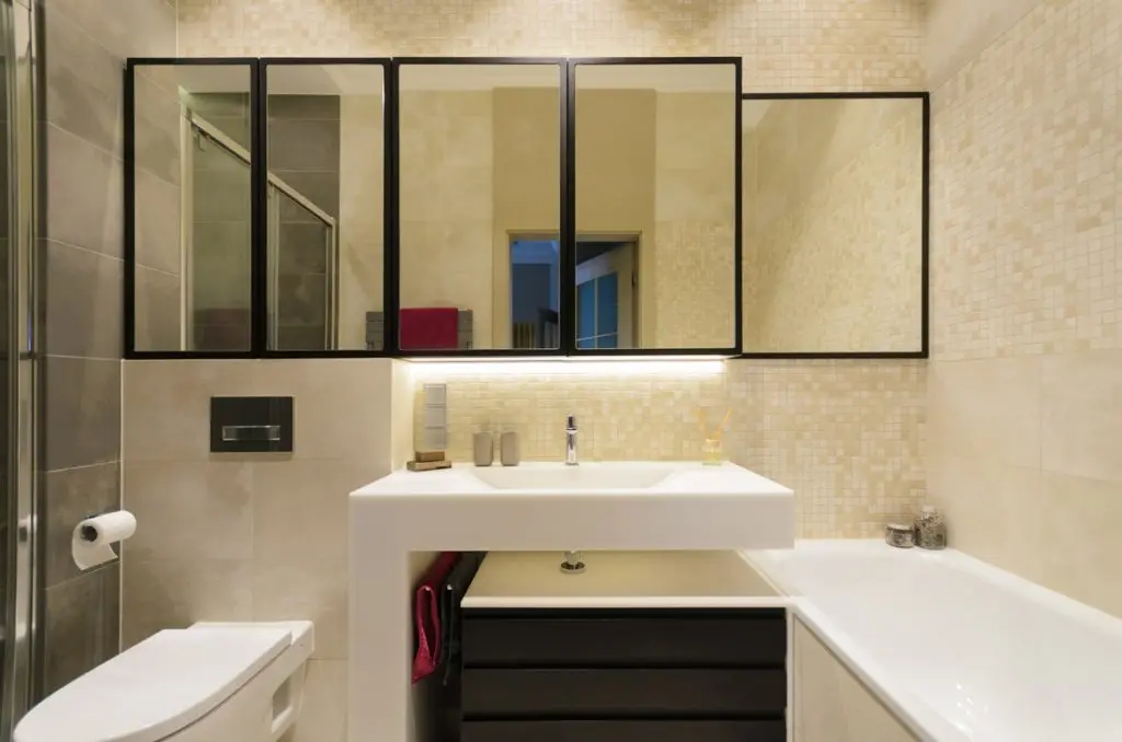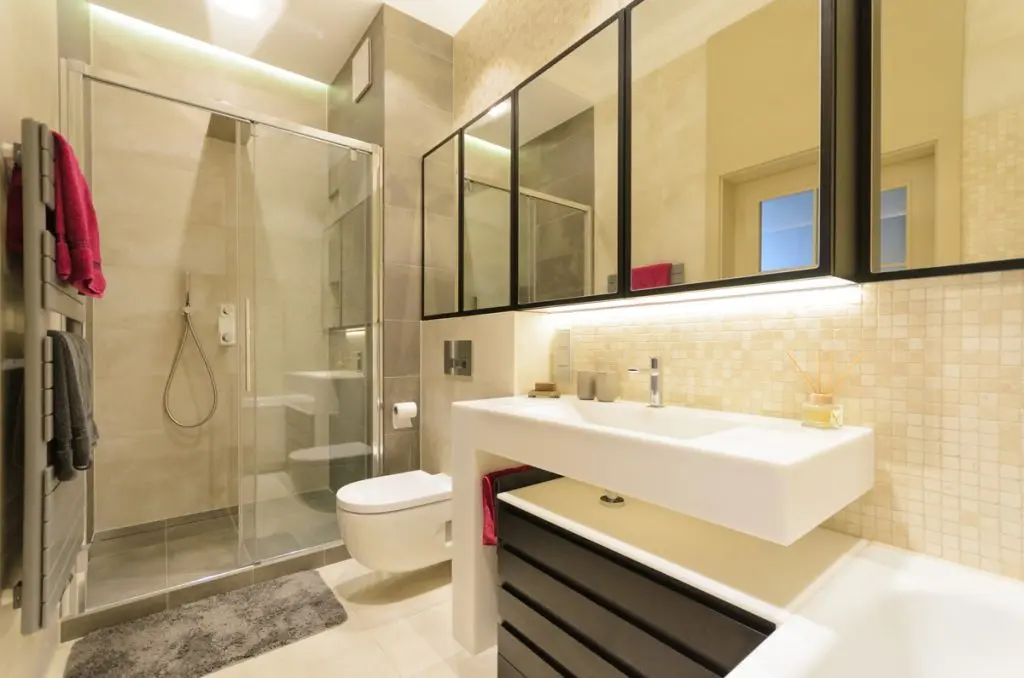 Baia generoasa are atat o cabina de dus, cat si o cada. Oglinzile sunt formate din 5 parti pentru a oferi impresia de spatiu. Lavoarul generos incadreaza perfect sertarele de depozitare.