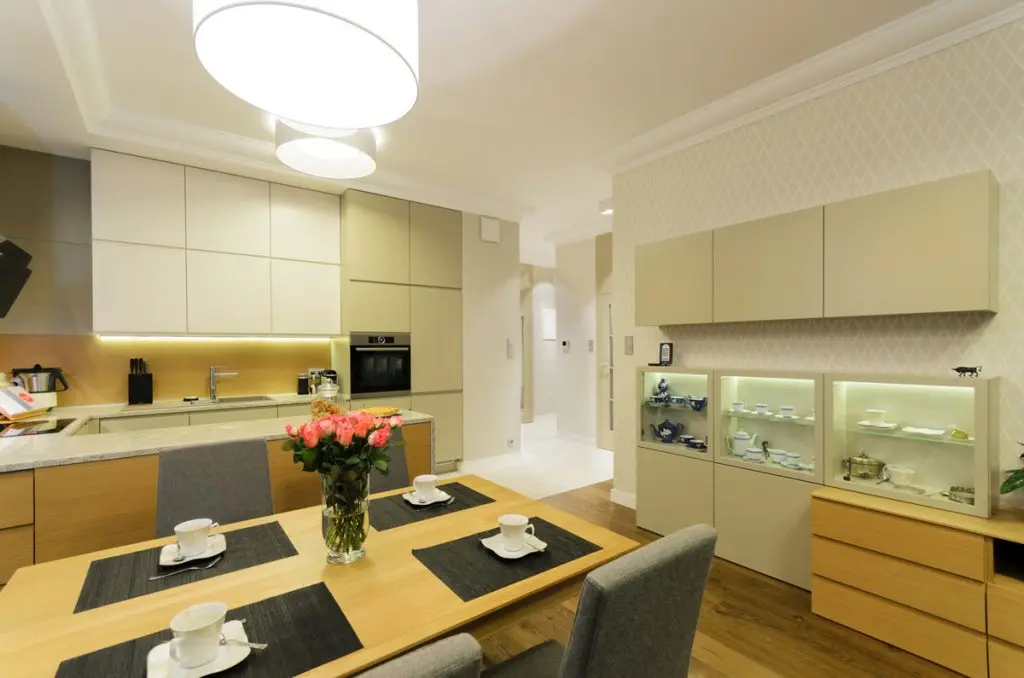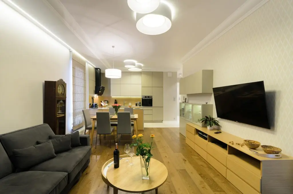 Zona de zi inglobeaza spatiul bucatariei si livingul alaturi de locul de luat masa. Designul este unul minimalist, cu cateva insertii clasice. Clasicul este scos in evidenta in primul rand de ceasul de perete care desparte livingul de zona de luat masa.