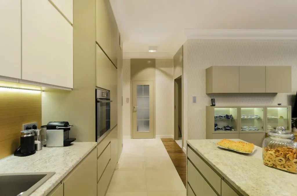 Bucataria este delimitata de zona de luat masa printr-o insula multifunctionala. Mobila este creata dintr-un M DF alb-gri care se regaseste si in biblioteca din living. Hota tip tub atrage privirile fiind parca un element de design mai mult decat functional. Bucataria beneficiaza de multe spatii de depozitare si de spoturi, ceea ce face gatitul mai facil.