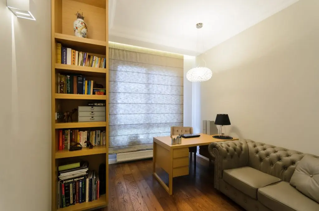 Biroul este amenajat modern in spirit clasic. Fotoliul Chesterfield si corpul de iluminat Foscarini imprima decorului eleganta si rafinament.
