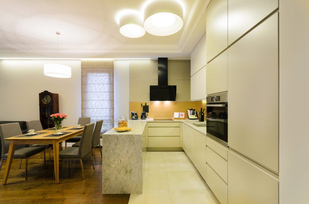 Bucataria este delimitata de zona de luat masa printr-o insula multifunctionala. Mobila este creata dintr-un M DF alb-gri care se regaseste si in biblioteca din living. Hota tip tub atrage privirile fiind parca un element de design mai mult decat functional. Bucataria beneficiaza de multe spatii de depozitare si de spoturi, ceea ce face gatitul mai facil.