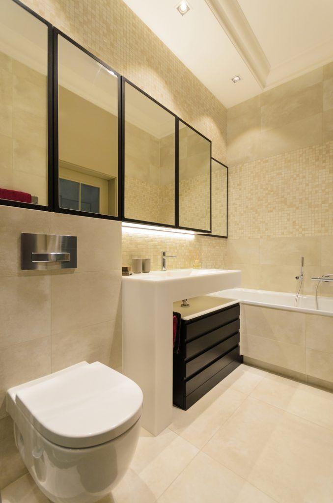 Baia generoasa are atat o cabina de dus, cat si o cada. Oglinzile sunt formate din 5 parti pentru a oferi impresia de spatiu. Lavoarul generos incadreaza perfect sertarele de depozitare.