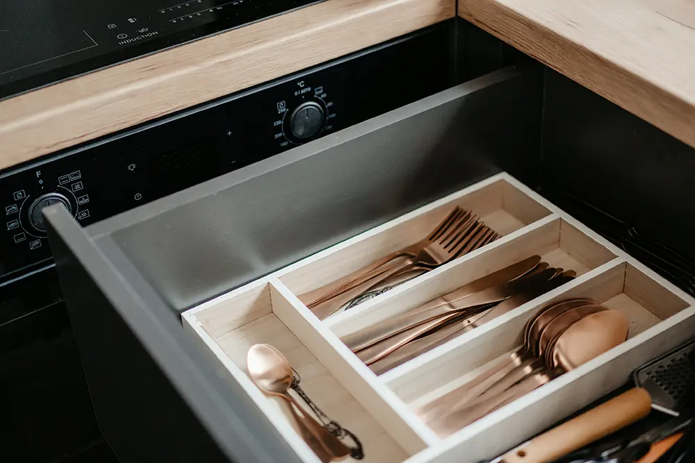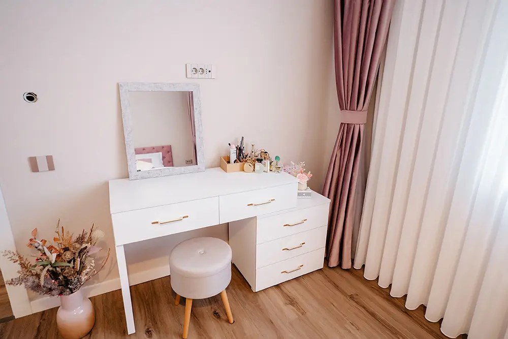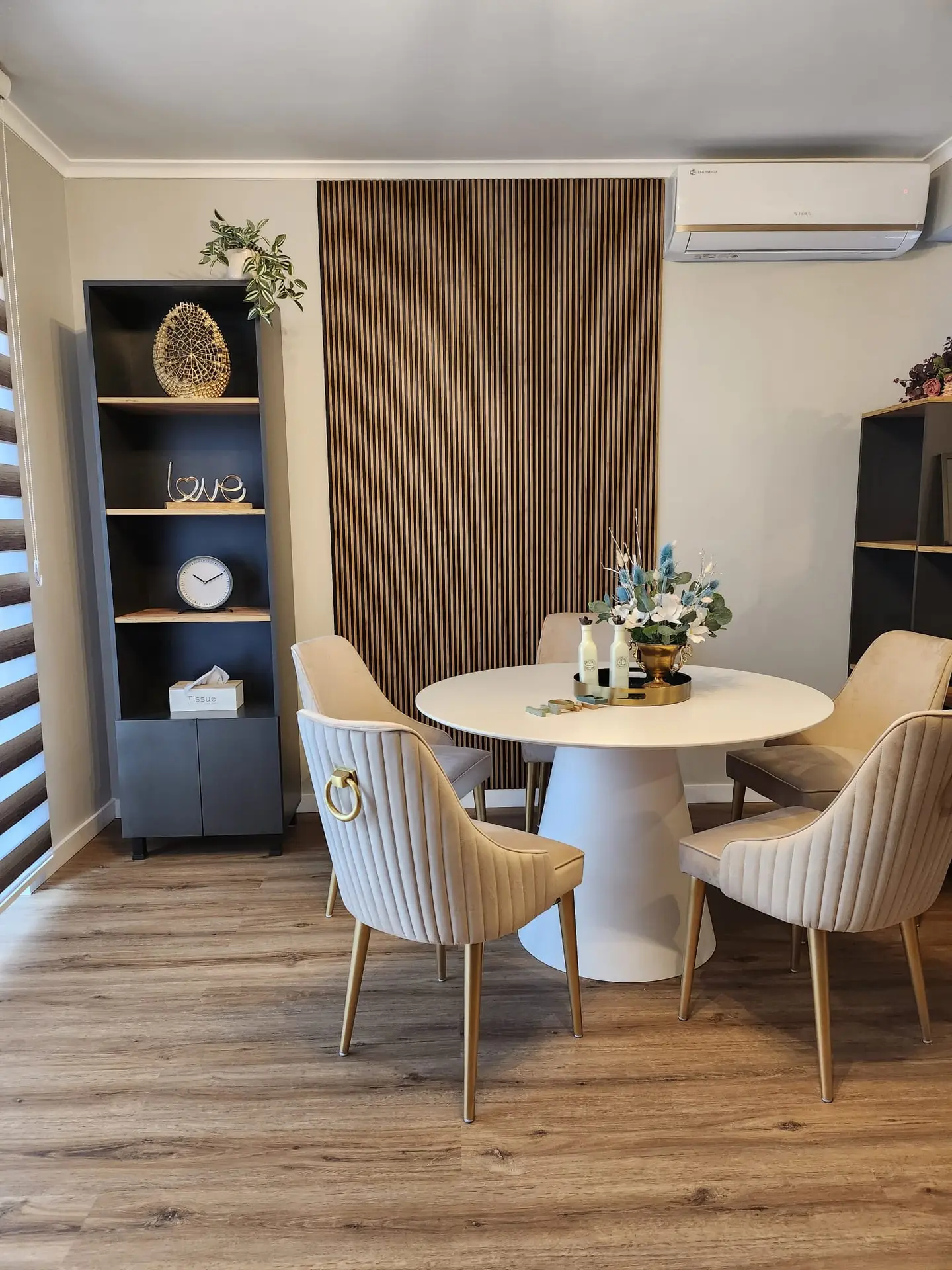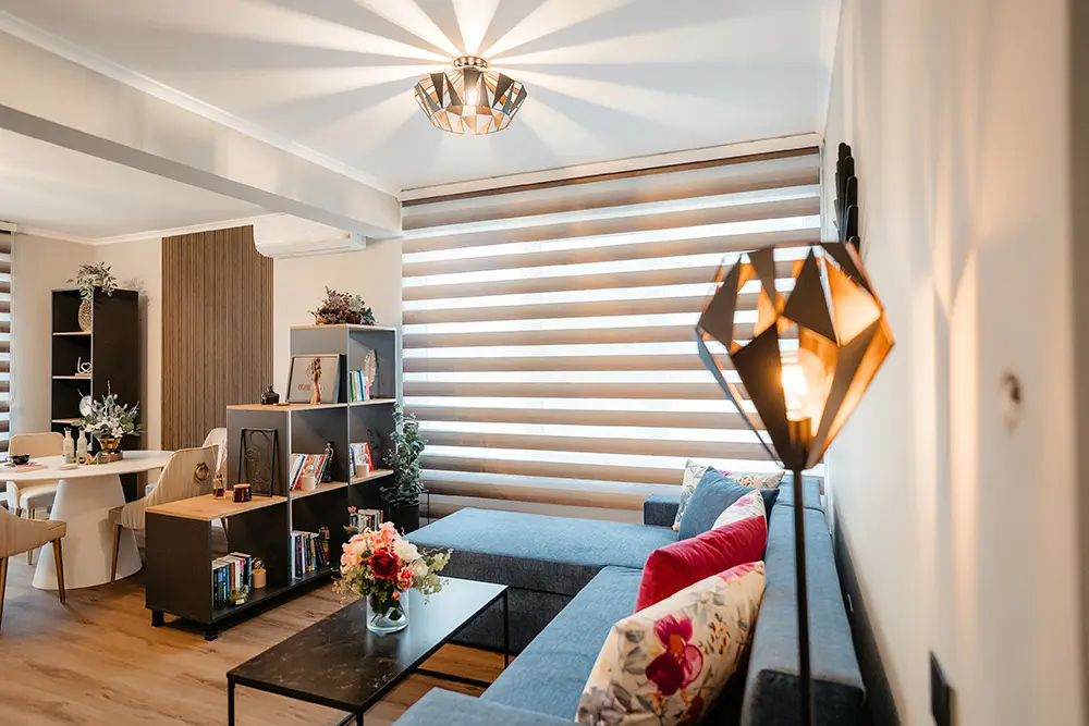 Planul casei este bine gândit, cuprinzând un living deschis cu zonă de dining și bucătărie open space, un dormitor principal, o cameră destinată copilului, un birou și două băi spațioase. În ciuda complexității designului, durata de implementare a proiectului a fost de doar 10 săptămâni, datorită unei colaborări strânse și eficiente între echipele implicate. Estetica este definită de o paletă cromatică neutra, în care culorile lemnului se combină armonios cu albastrul din zona de living și cu rozul din dormitor. Mobilierele, concepute și realizate exclusiv pe comandă, provin de la Mobila Terra din Oradea.