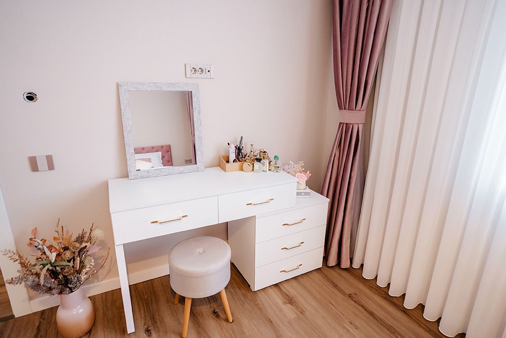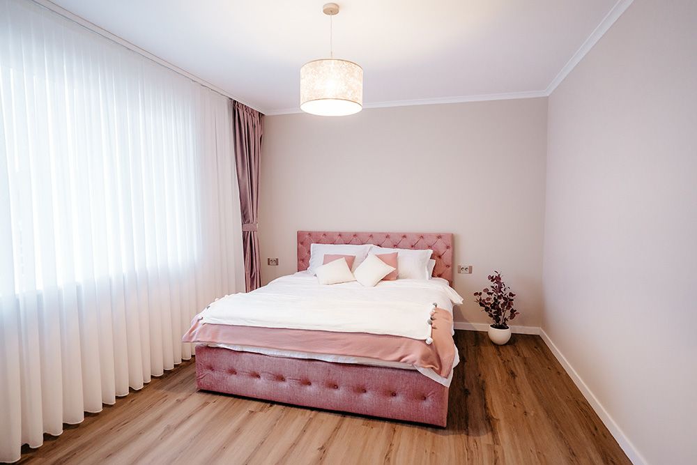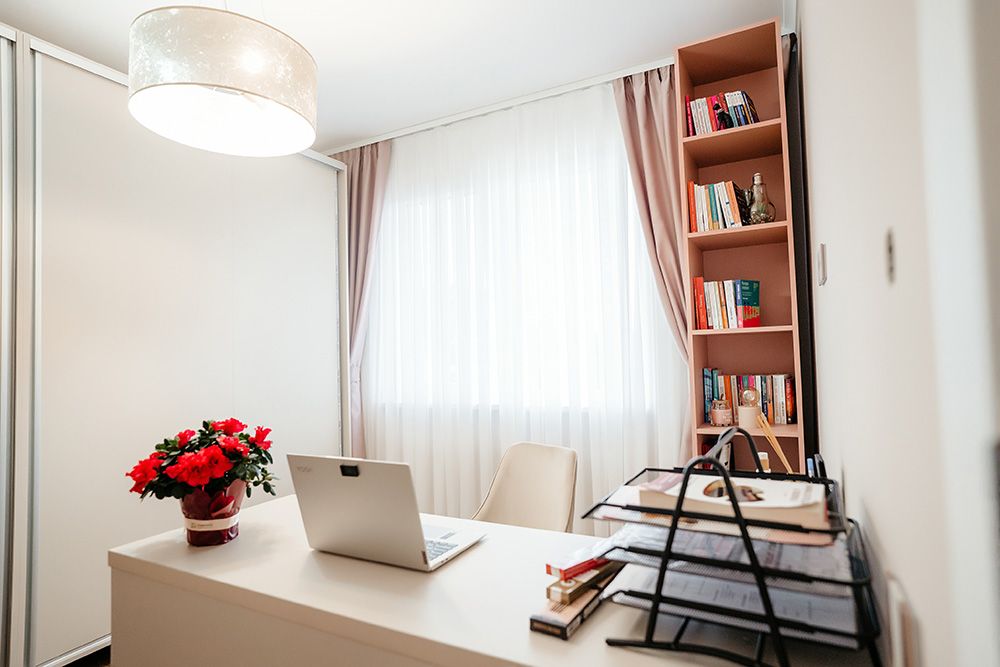 Planul casei este bine gândit, cuprinzând un living deschis cu zonă de dining și bucătărie open space, un dormitor principal, o cameră destinată copilului, un birou și două băi spațioase. În ciuda complexității designului, durata de implementare a proiectului a fost de doar 10 săptămâni, datorită unei colaborări strânse și eficiente între echipele implicate. Estetica este definită de o paletă cromatică neutra, în care culorile lemnului se combină armonios cu albastrul din zona de living și cu rozul din dormitor. Mobilierele, concepute și realizate exclusiv pe comandă, provin de la Mobila Terra din Oradea.