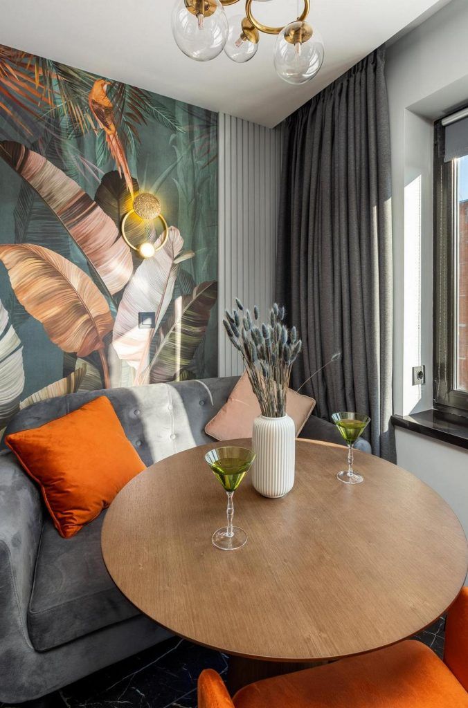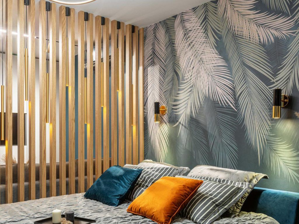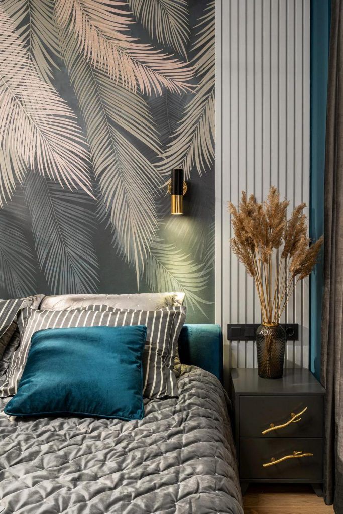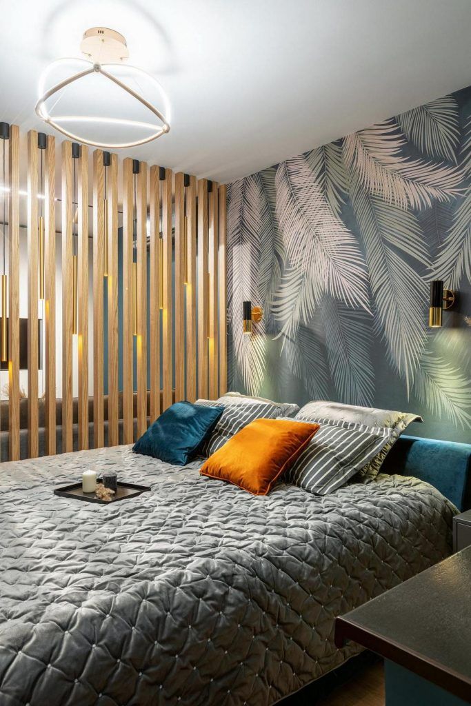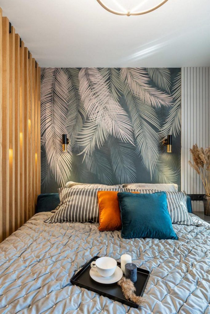 Zona de dormit iese din tipar prin peretele accent creat cu ajutorul tapetului cu imprimeu de vegetatie tropicala. Reuseste sa aduca un plus de prospetime, culoare si un echilibru din punct de vedere estetic. Patul, cu o latime de 180 cm are la randul lui spatii de depozitare, folosite in special pentru lenjerie.