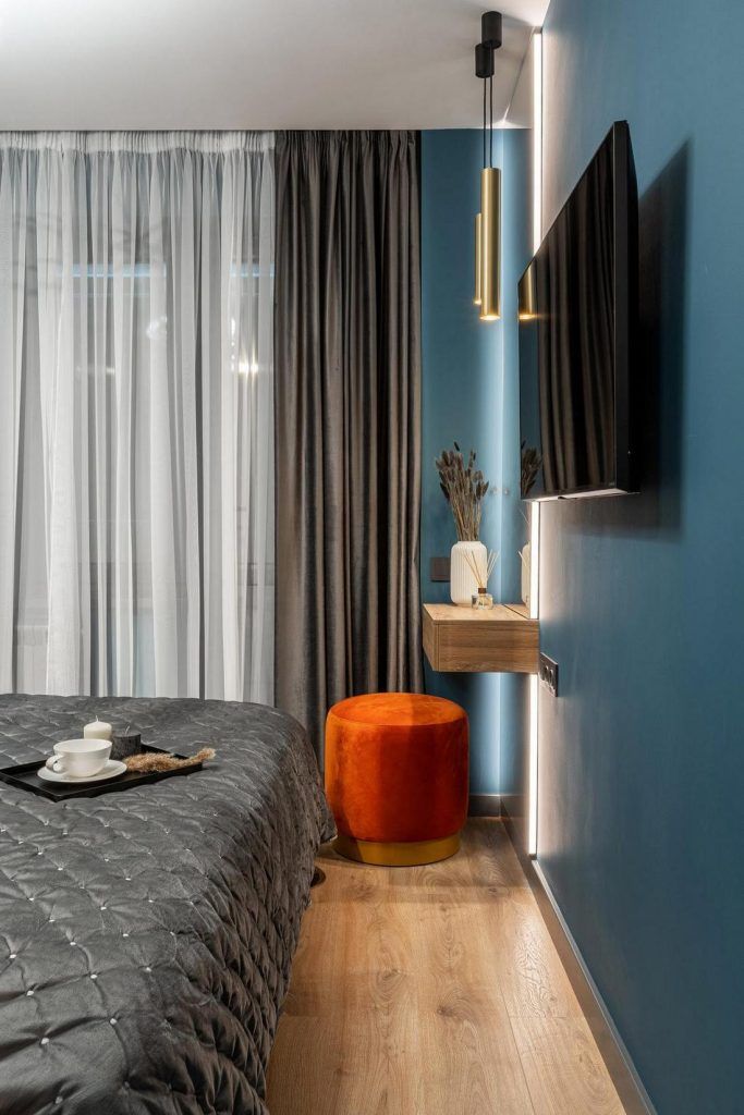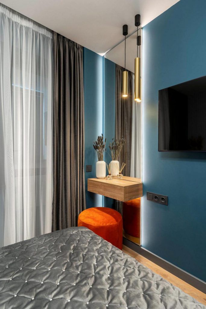 Accentele de portocaliu si nuantele de albastru ne intampina la tot pasul ceea ce ofera unitate si continuitate intregului spatiu. Putem spune ca aceasta cromatica ajuta la obtinerea unui interior echilibrat ce exprima masculinitate.