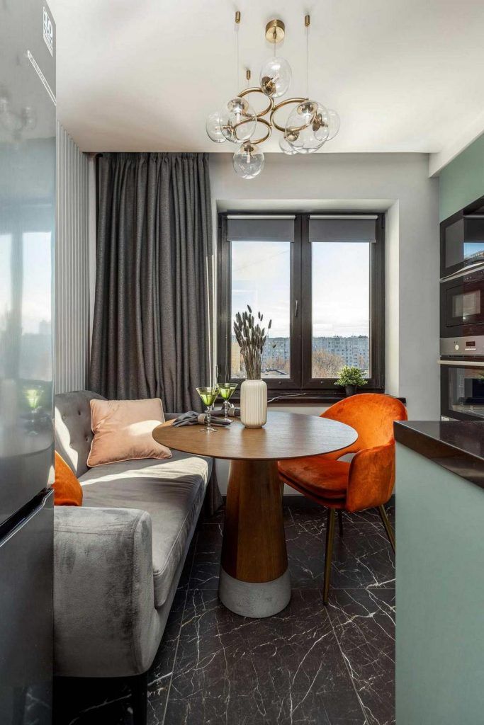 Bucataria este explorata functional prin amplasarea mobilierului pe doua laturi (si pana in tavan) obtinandu-se astfel spatiu si pentru restul pieselor de mobilier pe care tanarul si l-e dorit in aceasta incapere (o masa si o canapea). Tapetul cu motive vegetale este prezent si aici reusind sa aduca un plus de personalitate.