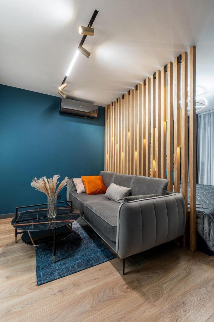 Deschide GaleriaMarea provocare a acestui proiect si principala cerinta a tanarului, a fost crearea unui loc de dormit fara a renunta la living. Designerul care a preluat amenajarea, a optat pentru delimtarea celor doua zone, la grilaje din lemn, o solutie moderna care in acelasi timp este si o varianta avantajoasa avand in vedere spatiul mic.