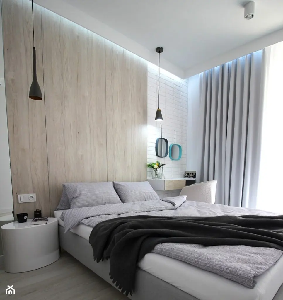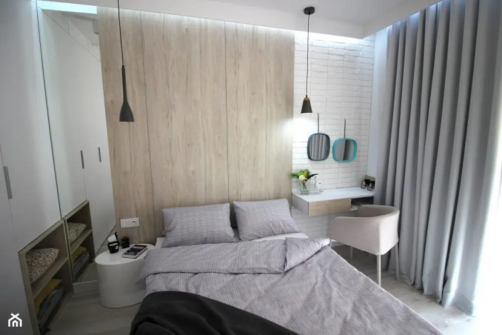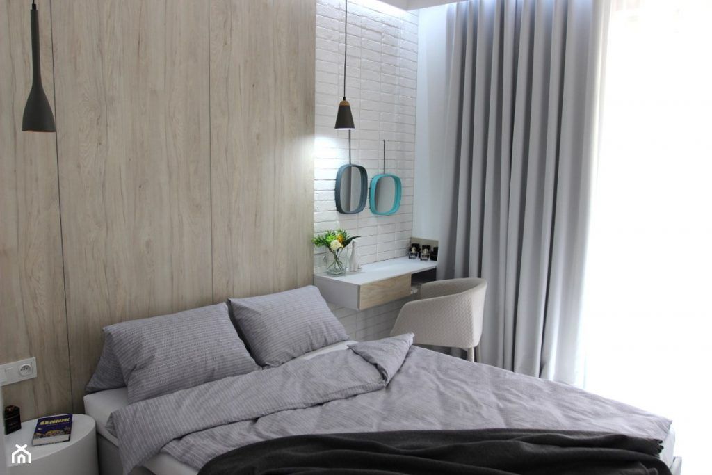 In dormitor, este amenajat si un spatiu de lucru cu birou in apropierea ferestrei. Tot aici, designerul a gandit o zona de depozitare generoasa in apropierea patului. Accesul spre terasa este acoperit cu perdele, iar draperiile asigura un somn confortabil. Dormitorul urmeaza linia unui decor minimalist, albul fiind predominant. Textilele in nunate de gri si placile din stejar natur din spatele patului echilibreaza cromatic acest spatiu care invita la odihna si relaxare.