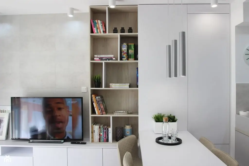 Altfel, livingul este dotat minimal cu o canapea, doua masute de cafea, o zona pentru T V si un corp de mobilier construit in continuarea acesteia care include o biblioteca deschisa si un corp dotat cu usi. Diversitatea corpurilor de iluminat: incastrate, suspendate sau aplicate pe tavan asigura un iluminat artificial optim general, dar si de accent.