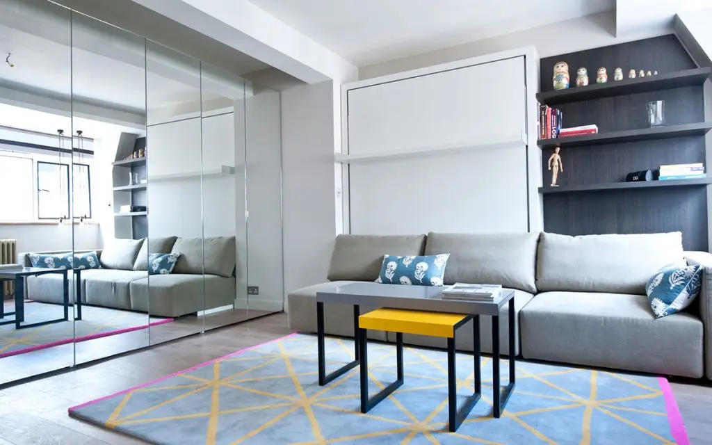 Surprinzator este faptul ca patul dublu se trage in jos din perete, peste canapea, oferind posibilitatea unui somn placut si odihnitor, si lasand, totodata, pe timpul zilei spatiu de desfasurare prin plierea acestuia.