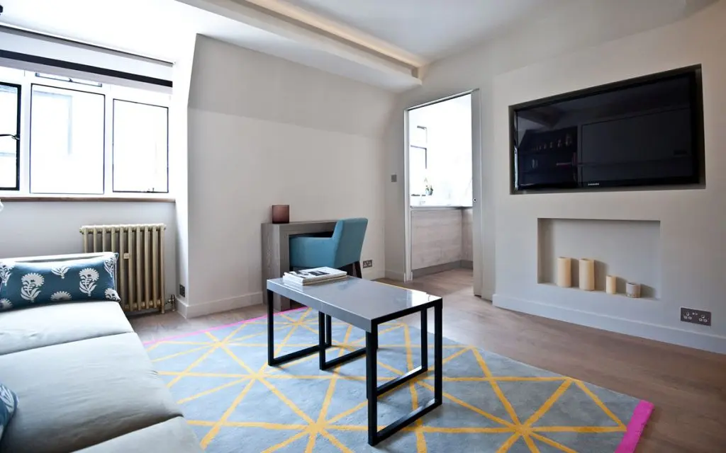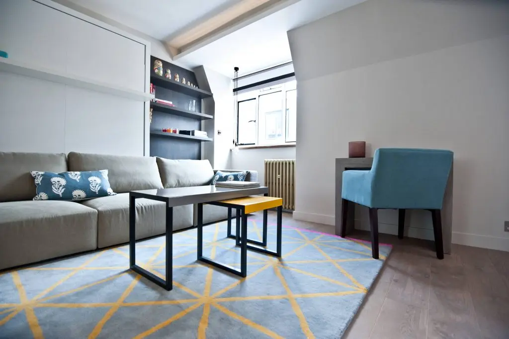 Pentru mobila si canapea au fost alese culori pale, in scopul de a maximiza impresia de spatiu deschis si au fost adaugate accente de culoare prin covor si perne decorative.