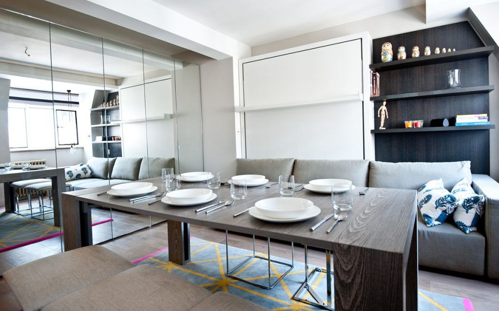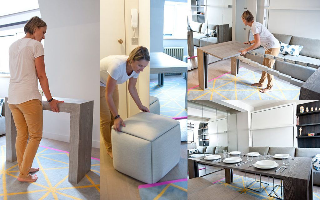 Surprinzator este faptul ca patul dublu se trage in jos din perete, peste canapea, oferind posibilitatea unui somn placut si odihnitor, si lasand, totodata, pe timpul zilei spatiu de desfasurare prin plierea acestuia.