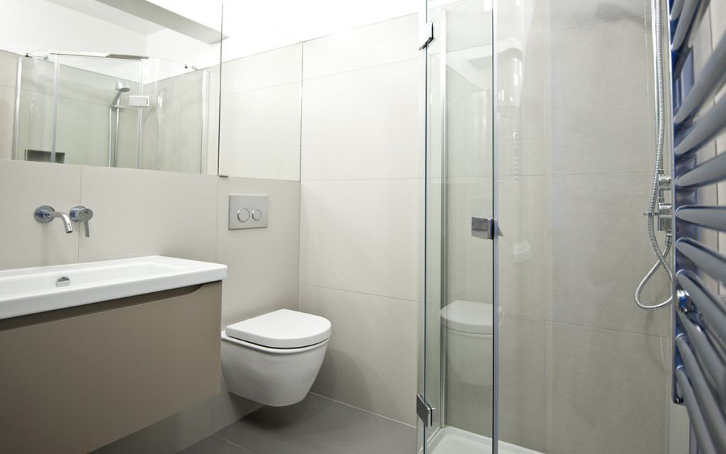 In ceea ce priveste baia, s-a optat pentru o cabina de dus in forma de diamant deoarece ocupa mai putin spatiu si are un aspect minimal. Vasul de toaleta suspendat si rezervorul vasului ce este incastrat in perete, pe langa faptul ca ofera o nota sofisticata si ingrijita, dau posibilitatea crearii unui spatiu de depozitare suplimentar deasupra rezervorului. Acesta este mascat bine datorita usii cu oglinda.